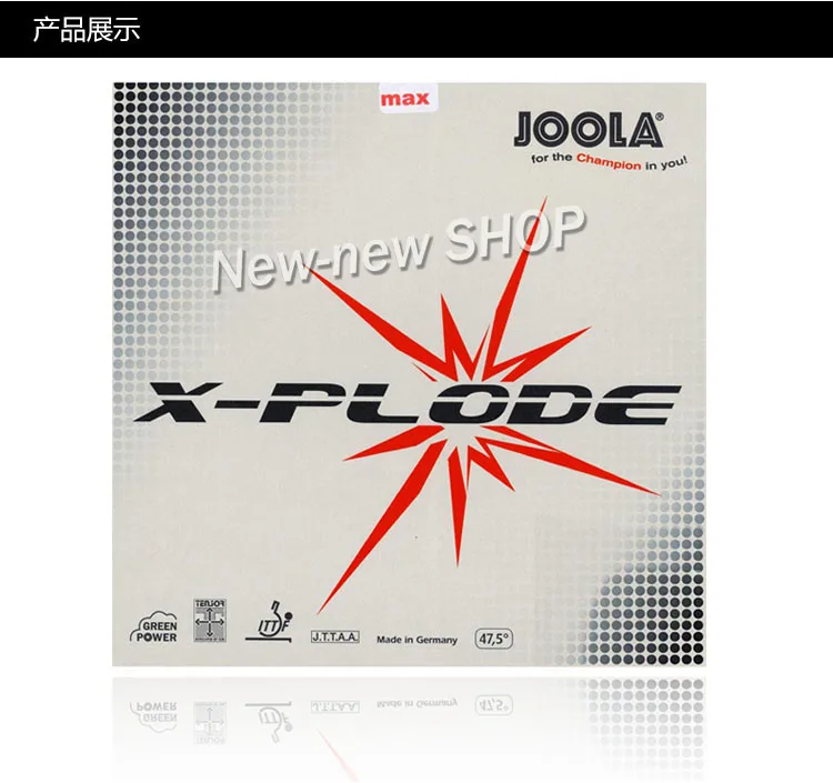 -Ранее известный как JOOLA Express X-Plode. -Средний-высокий угол броска идеально подходит для агрессивной игры средней дистанции. -С момента запрещения скоростного клея JOOLA Express с включенным эффектом скоростного клея вызывает ощущение среди игроков, которые искали альтернативу скоростному клею. X-Plode представляет специальную версию Express: с пористой, более плотной губкой и шпиннистым верхним листом. Стиль: быстрая атака/петля Скорость: макс Спина: макс Управление: хорошая Толщина: 2,0/Max