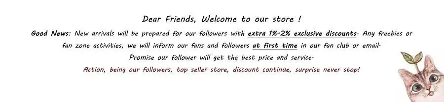DeArДрузья, добро пожаловать в наш магазин! Хорошие новости: Новые поступления будут подготовлены для наших подписчиков с дополнительными 1%-2% эксклюзивными скидками. Любые действия в зоне халява или фаната, мы сообщим нашим фанатам и последователям в наш фан-клуб или по электронной почте. Обещаем, что наш последователь получит лучшую цену и сервис. Действие, быть нашими последователями, магазин лучших продавцов, скидки продолжаются, сюрприз никогда не останавливается!