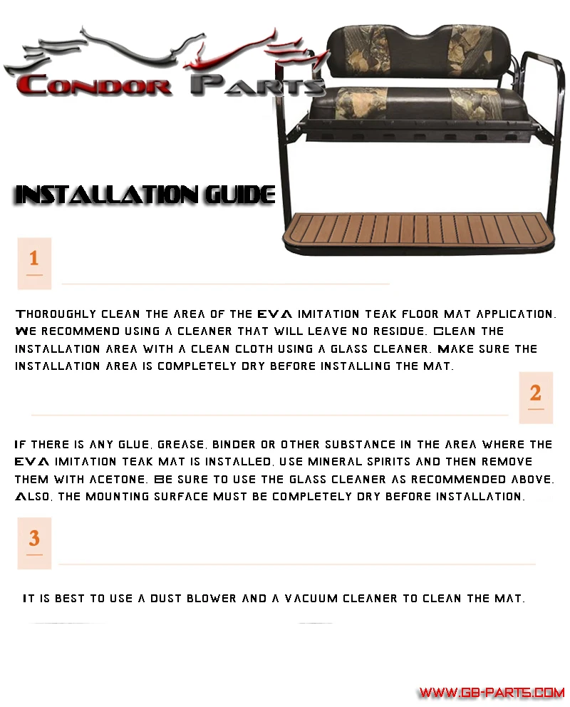 EVA-это новый тип экологически чистого пластикового материала с хорошей амортизацией, ударопрочностью, теплоизоляцией, влагостойкостью, химической стойкостью и т. д., не токсичен и не впитывает влагу. Condor Parts, новые наборы для автомобильных сидений для гольфа, Противоскользящий коврик, изготовленный из этого нетоксичного и безвкусного высококачественного материала, это лучший выбор для одевания вашей тележки для гольфа. Вес коврика-светильник, хорошая текстура, высокая устойчивость к скольжению и долговечность. Разные ощущения. Давайте оденем вашу корзину для гольфа!