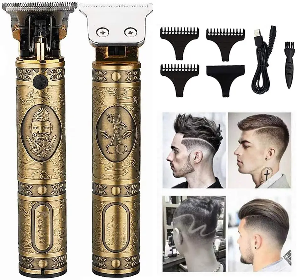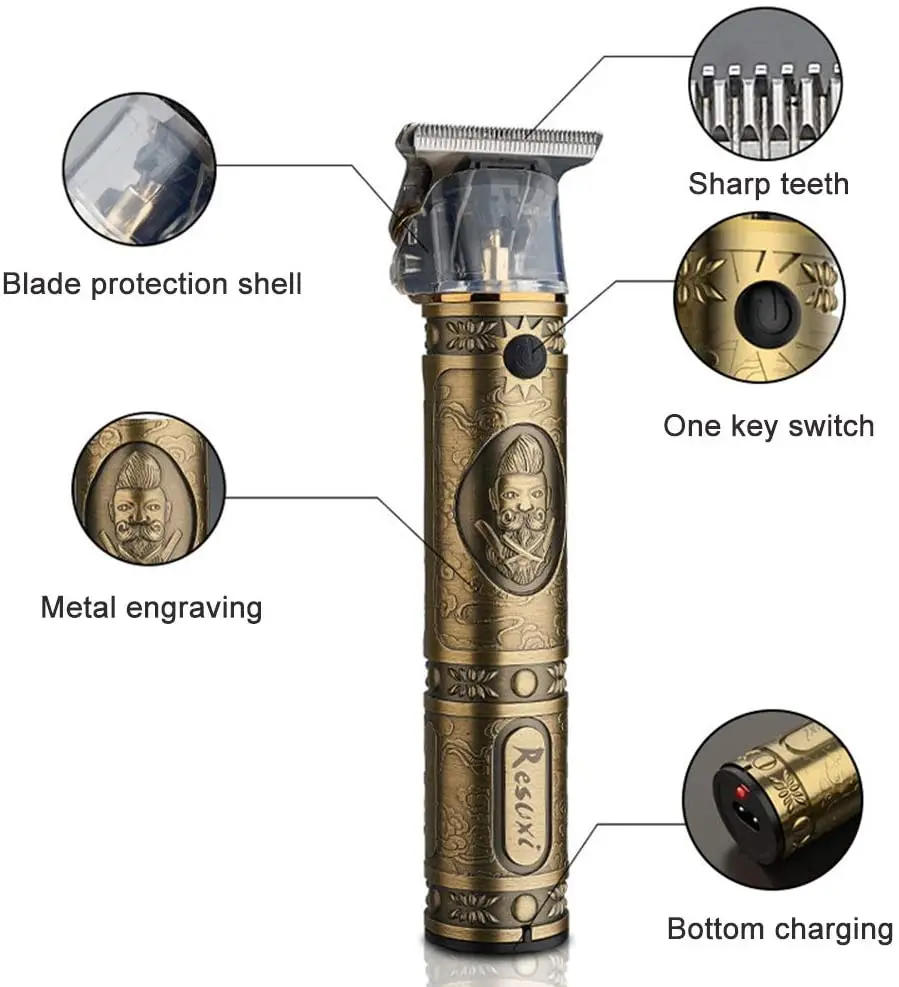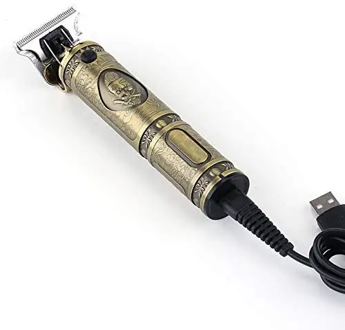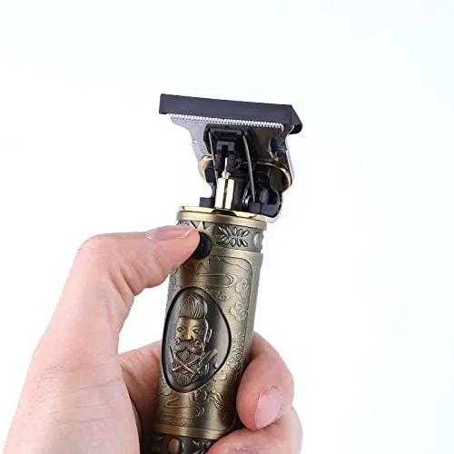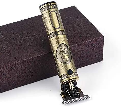 1. Bronze body with exquisite carving pattern on the whole machine, retro and stylish. 2. The stainless steel suspension holder breaks the rules and has a new design. The suspension bracket does not block the sight when cutting hair and it improves the heat dissipation performance, allows you to clean the hair easily. 3. Equipped with a transparent protective cover one the cutter head, which does not affect the sight while catching the hair. Come with 3 guide combs(1/2/3 mm) to create various hairstyles. 4. Charging indicator. Green light when it is operating. Red light when it is charged and the light turns green when fully charged. 5. Cordless hair clipper powered by a rechargeable 1200mAh lithium battery, charging 2 hours for 120 minutes operating.