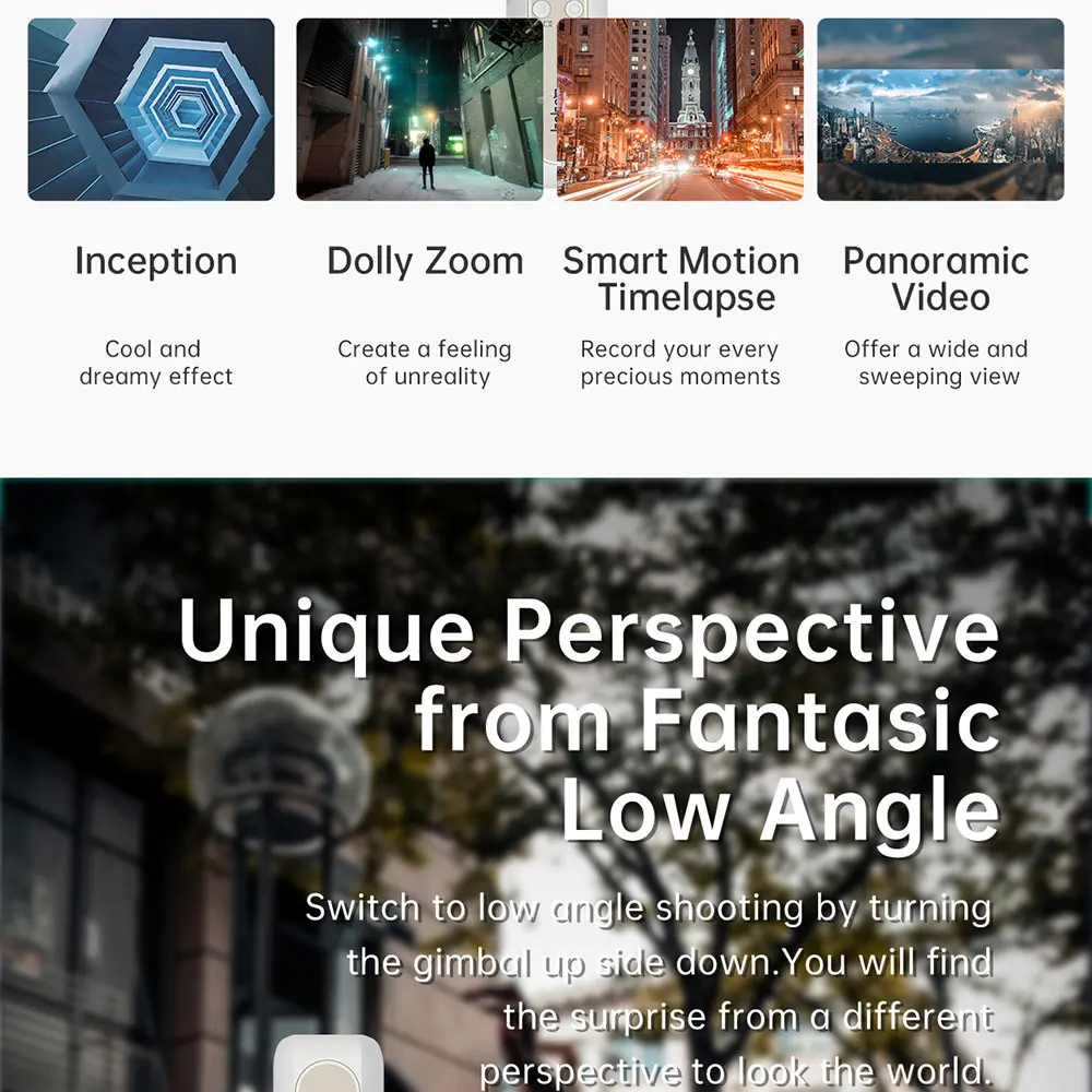 🗽Выдающаяся стабилизация производительности🗼Бесщеточный двигатель и iSteady 4,0 Система антивибрационного алгоритма нашего карданного шарнира обеспечивает вам плавную съемку и помогает вам легко делать кинематографические снимки. Он держит телефон, который весит ниже 280 г (0,62 фунтов) устойчивый. Вы можете настроить четыре следующих режима, которые являются панорамирование и наклон следовать/панорамирование/все следовать/Все Блокировка и скорость отклика для удовлетворения ваших потребностей съемки и производить замечательные видео. Вы даже можете снимать под низким углом, сохраняя высокую четкость.