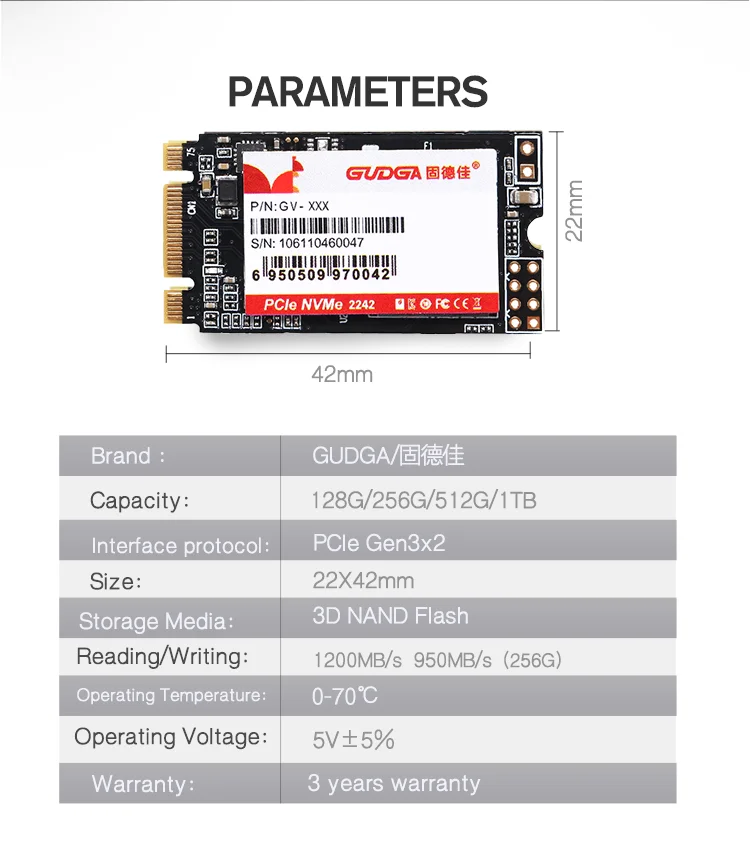 Применимые модели: Рабочий стол/ноутбукИнтерфейс: M.2 SSD (протокол NVMe)Протокол передачи: NVMe Gen3 × 2Флеш-память NAND: 3D NANDРазмер: 42 мм × 22 мм × 3 ммЁмкость: 128 Гб/256 ГБ/512 ГБ/1 ТБ/2 ТБСкорость чтения и записи: до 1500/1000 МБ/с.Время выборки: 0,01 мсВход напряжение: 3,3 V ± 5%Температура хранения: -20 ℃ ~ + 75 ℃Срок гарантии: 3 года гарантии