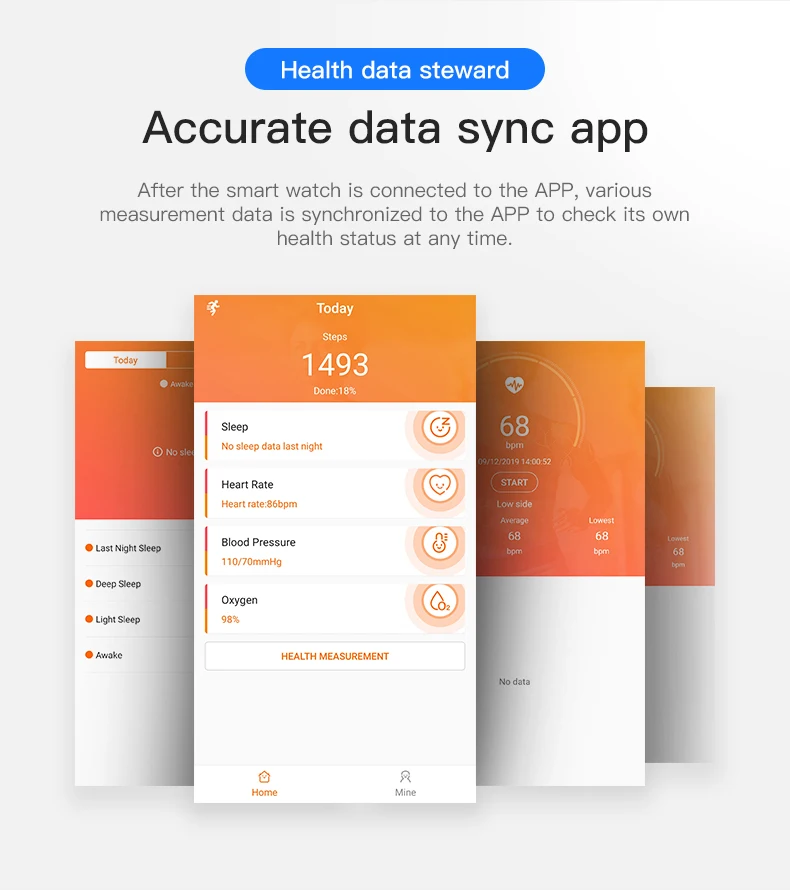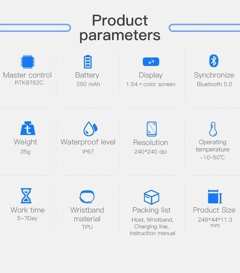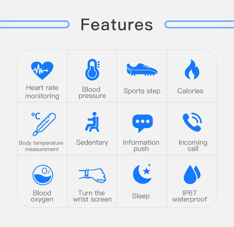 Время, шаги, расстояние, калории, мониторинг сна, несколько режимов упражнений, напоминание о сидячем положении, отключение, напоминание о звонках, толчок информации (wechat, QQ, Facebook, line, WhatsApp, kakao talk и т. д.) мониторинг температуры тела, таймер, поиск на мобильный телефон, многоязычный, мониторинг сердечного ритма, Мониторинг Артериального Давления, мониторинг кислорода в крови
