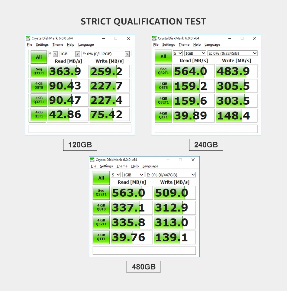 Dimensions: 2.5 inches 100.4×70×7.0mm (length×width×height)+0.5mmInterface and compatibility: SATA interface supports Serial ATA Revision 3.0, backward compatible with SATAⅡSupported systems: Windows XP, Windows 7, Windows 2003, Windows 2008, DOS, linux, unixCapacity: 120GBNAND flash memory: 3D QLC 3D QLC 3D QLCRead/write speed (MB/s)240GB 440~480(MB/s)4K random read/write IOPS240GB 21240~4668(IOPS)4K continuous read/write IOPS240GB 91200~82900(IOPS)Average access time240GB 0.09msElectrical characteristics Input voltage240GB DC 5V±5%Idle power consumption240GB: 0.55WWorking power consumption: 240GB 1.18WReliability and stability Write life (100GB/day) It can be used for 3 years to write 50GB data per dayReading life unlimitedData storage can be stored for more than 10 years at 25 degreesMean time between failures 1 million hoursError checking and correction Hardware LDPC ECC capable of correcting errors up 2K ByteFLASH management system automatic bad block managementEnvironment Working temperature 0~+70℃Storage temperature -20~+75℃Ambient humidity 5-95%Warranty time 3 years warranty;Certification CE, ROHS, FCC,Mass production statusTest platform CPU: Intel® Core (TM) i3-6100 CPU @ 3.70GHzChipset: Intel® Z270 Express ChipsetMemory: Kingston KHX1600C9D3C1K2/4GXOS: Microsoft Windows 10 Professional 64-bitAHCI Driver: Server Express Chipset SATA AHCI ControllerBIOS Settings: AHCI ModeTest software Crystal Disk Mark 5.2HD Tune Pro5.0ATTO Disk BenchmarkIOmeter 2008 AS_SSD Benchmark