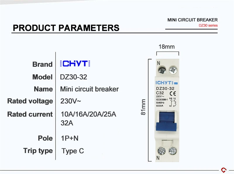 ICHYTI TPN DZ30-32 1P + N Мини выключатель MCB 10A,16A,20A,25A,32A