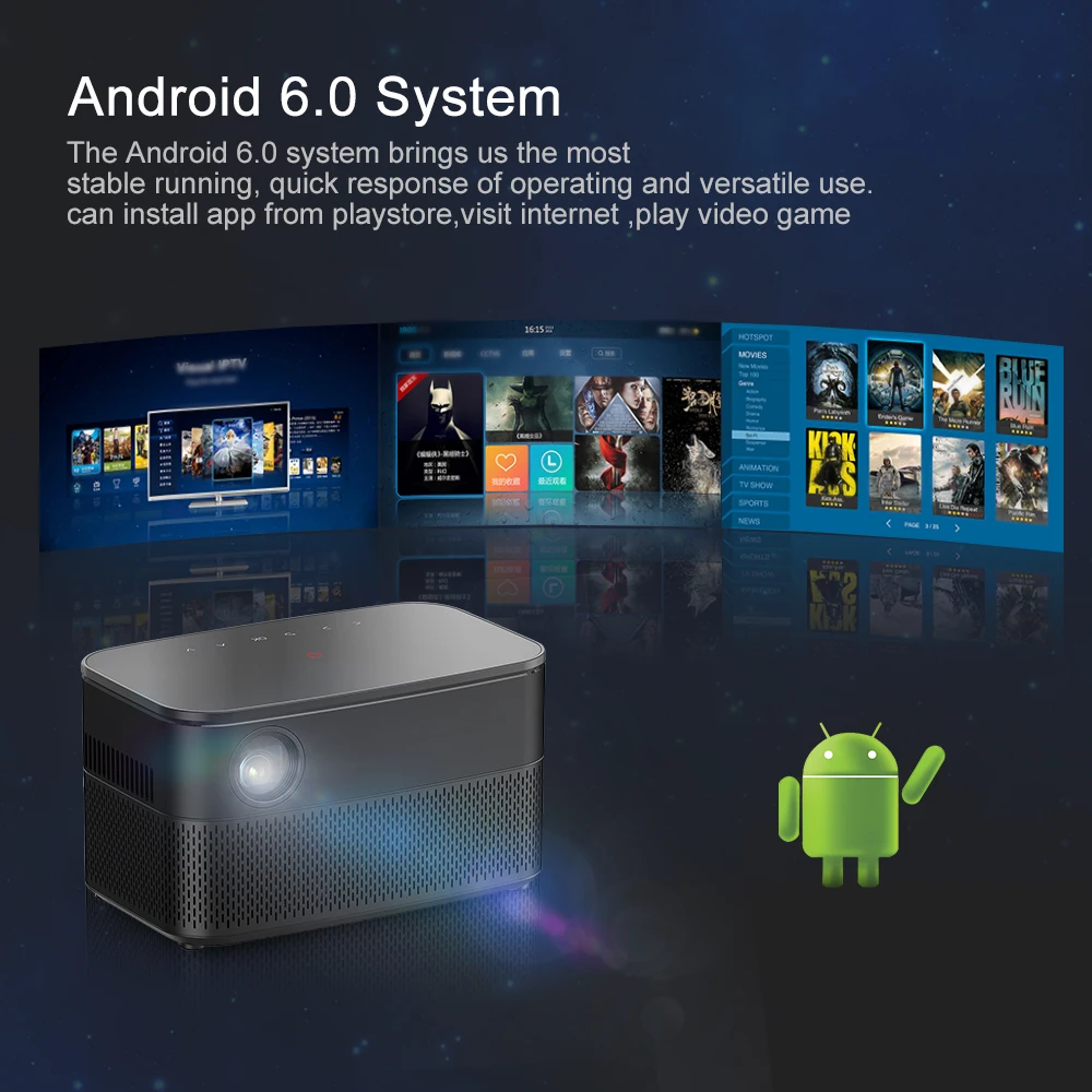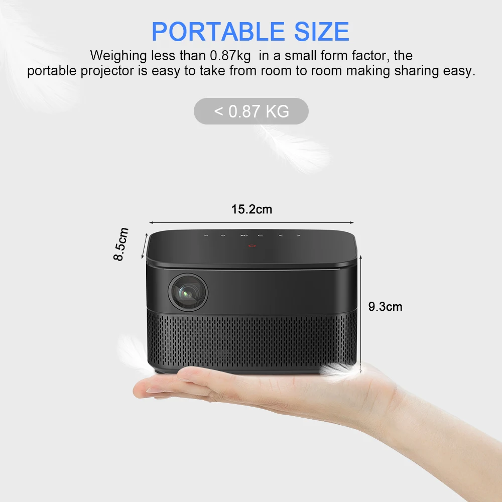 Встроенный 2.4G / 5.8G двойной Wi-Fi, может быстро и плавно отразить смартфон на проектор через Airplay / Miracast / DLNA / Eshare. Проецирование через смартфон без подключения проектора, так что вы можете свободно перемещаться по комнате, ваша деловая жизнь станет удобной и профессиональной.