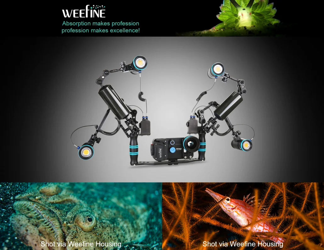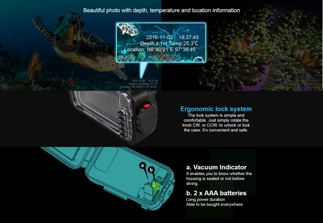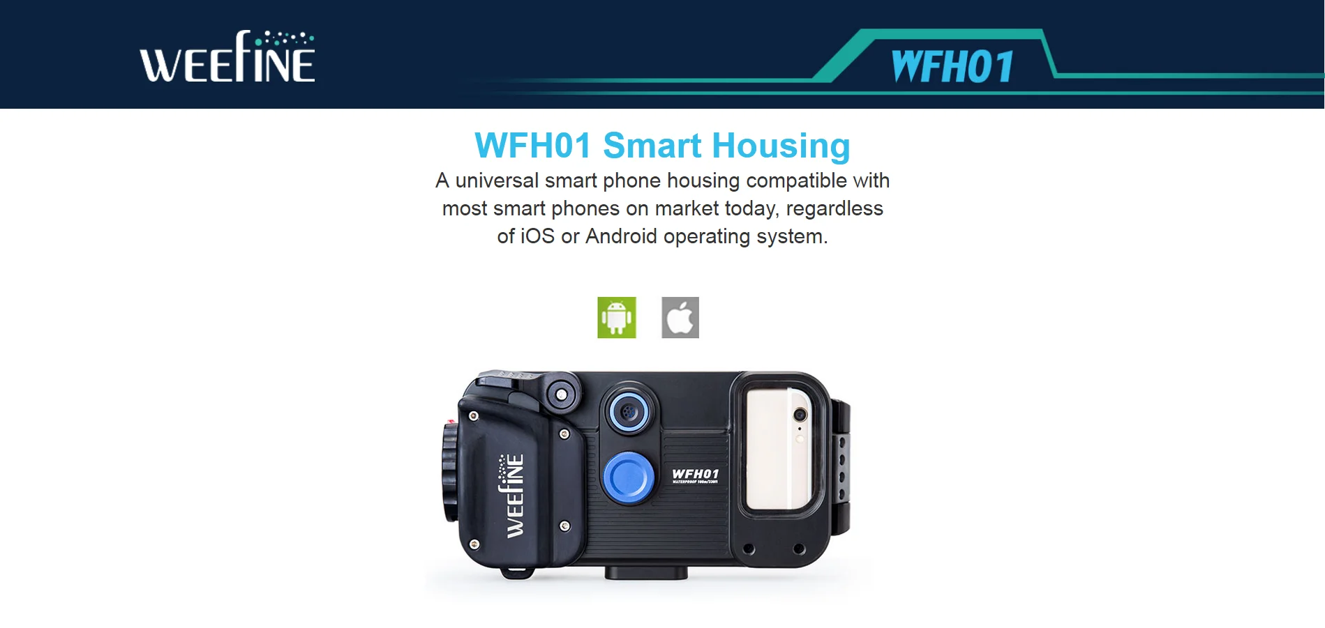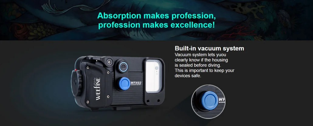Features: - Aluminum Alloy + PC + PA+ABS construction - Built-in vacuum check system - Adjustable phone clamp suitable for most phone sizes. - Depth rated to 80m - Powered by 2 x AAA batteries (battery not included) - Can be mounted on to most housing trays - Dimensions: 205mm (w) x 105mm (h) x 61mm (d) inside dimension: 158mm (w) x 83mm (h) x 9 mm (d) - Weight on land: 860g Included accessories: Vacuum pump, Spare O-ring, Lanyard, user manual, travel case NOTE: Weefine Smart Housing is sold in North America as Kraken Smart Housing. The products are identical and all the accessories will work. The app availability might vary. TECH INFO WFH01 Smart Housing A universal smart phone housing compatible with most smart phones on market today, regardless of iOS or Android operating system. Download Weefine Smart Housing app from the App store and start Bluetooth connection with the housing. You can shoot stills and video and choose underwater filtration and even focus lock. Built-in vacuum system Weefine Smart Housing has vacuum leak check circuitry and valve built-in. Just use the included pump to secure your housings against leaks before your dive. Vacuum system lets yuou clearly know if the housing is sealed before diving. This is important to keep yourdevices safe. Vacuum Indicaton: It enables you to know whether the housing is sealed or not before diving. 2 x AAA batteries: Long power duration, able to be bought everywhere Built-in depth sensor & dive log Depth sensors can detect real-time diving depth and temperature and the depth and temperature data can be recorded on photos or videos. Beautiful photo with depth, temperature and location information Phone clamp is adjustable The adjustable phone clamp enables the case to fit different sizes of smartphones on the market today. Ergonomic lock system The lock system is simple and comfortable. Just simply rotate the knob CW. or CCW. to unlock or lock the case. It’s convenient and safe. Wet Mount Lenses The Smart Housing can be used with most underwater lenses with additional M52 lens holder. Use fisheye lenses like The Weefine WFL02 or other generic UWL-04 type lenses. M67 wide-angle and close-up lenses can be used with a supplied 52-67mm step-up ring. ITEM INCLUDES Weefine WFH01 Smart Hosing Nylon landyard Spare O-ring Lens cleanning tissue Hand vacuum pump User´s Manual