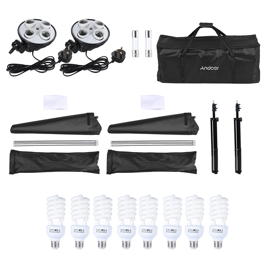 Этот студийный комплект включает в себя 2 * софтбокса/8*45 Вт лампы/2 * лампы гнездо/2 * свет стенд/1 * сумка для переноски.