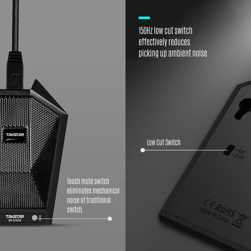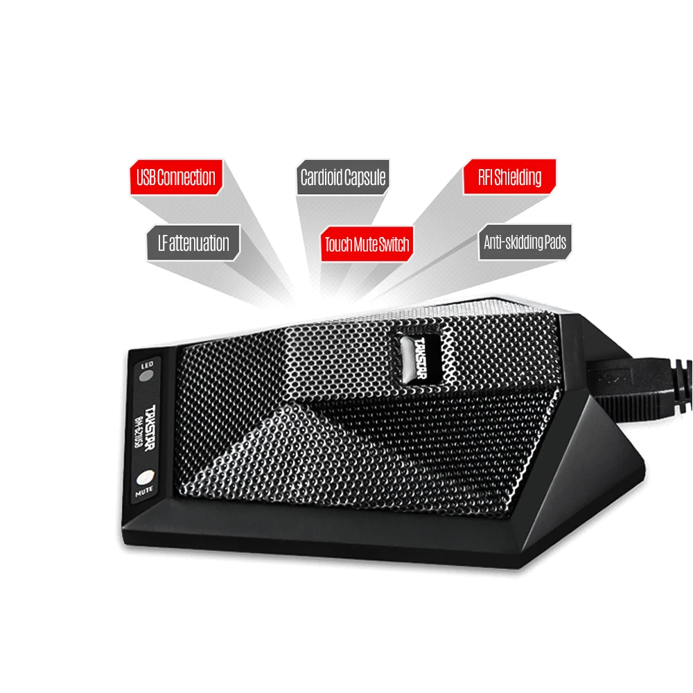 Противоскользящие накладки предотвращают скольжение микрофона и уменьшают вибрационное воздействие на стол; Сенсорный переключатель отключения звука устраняет механические шумы традиционного переключателя.