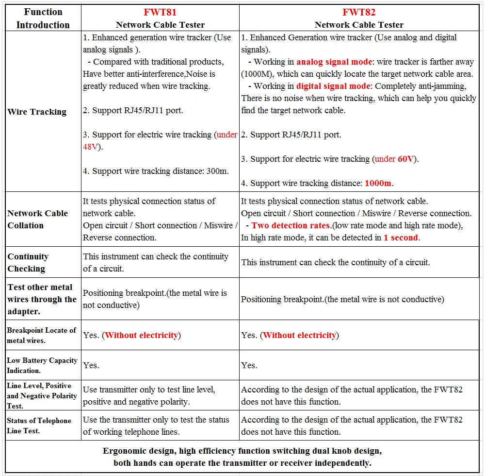 -Как последнее поколение сетевого кабеля трекер в 2019 году, FWT82 имеет полностью анти-помех характеристики. Существует два режима работы для цифровых и аналоговых сигналов. Отслеживание более точное. Можно охотиться при наличии напряжения (менее 60 в).