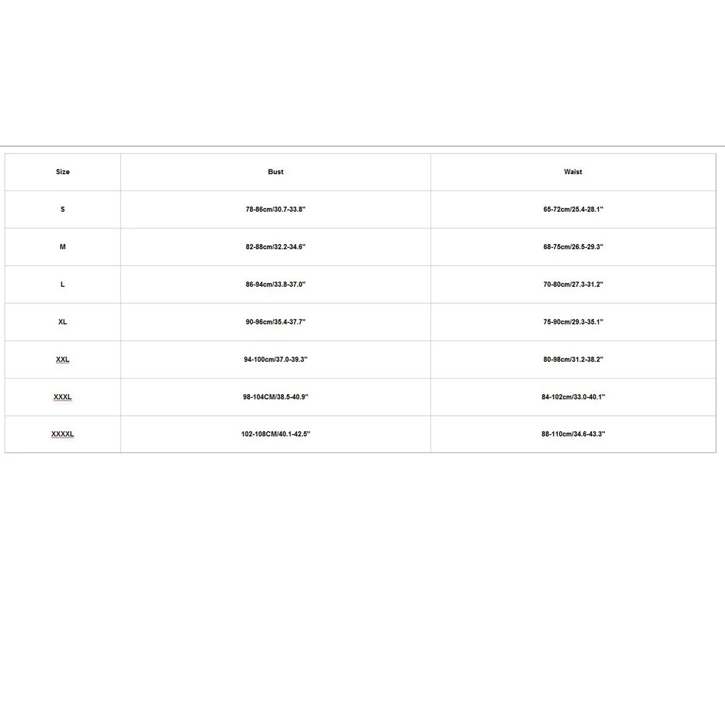 Размер Бюст Талия S 78-86 см/30,7-33,8" 65-72 см/25,4-28,1" М 82-88 см/32,2-34,6" 68-75 см/26,5-29,3" L 86-94 см/33,8-37,0" 70-80 см/27,3-31,2" XL 90-96 см/35,4-37,7" 75-90 см/29,3-35,1" XXL 94-100 см/37,0-39,3" 80-98 см/31,2-38,2" XХХL 98-104 см/38,5-40,9" 84-102 см/33,0-40,1" XXXXL 102-108 см/40,1-42,5" 88-110 см/34,6-43,3"