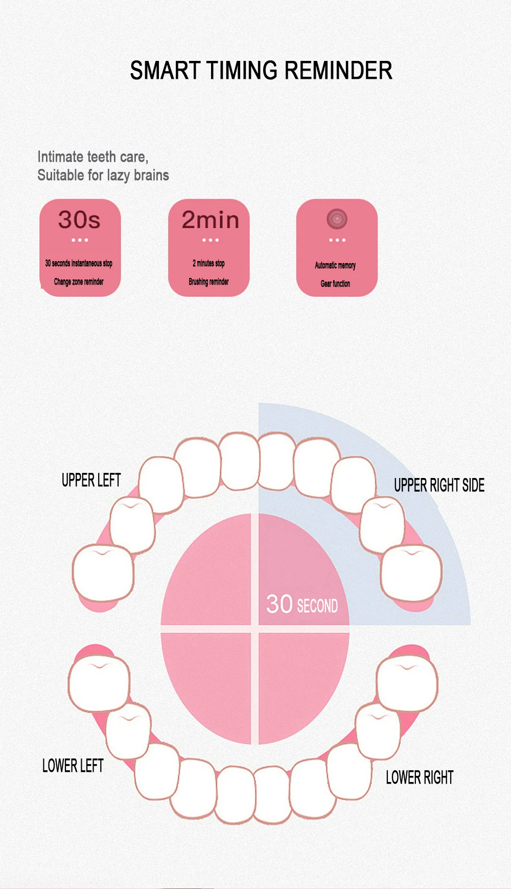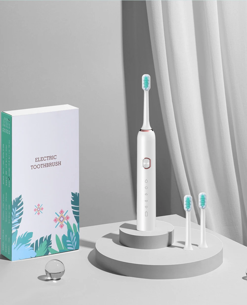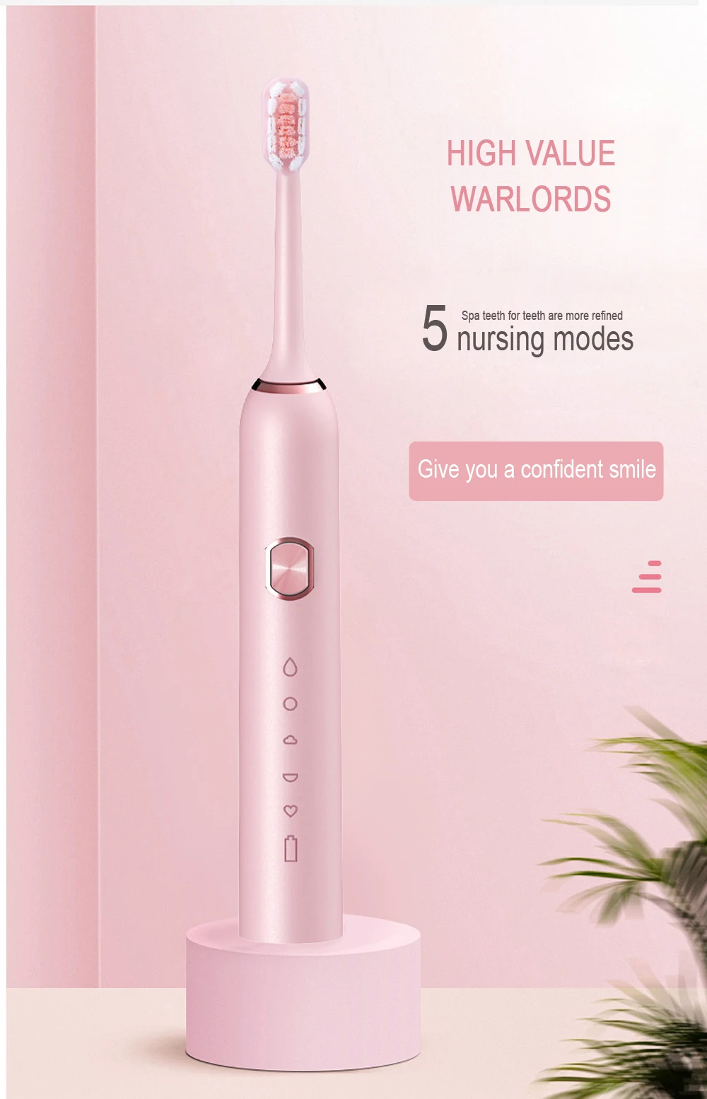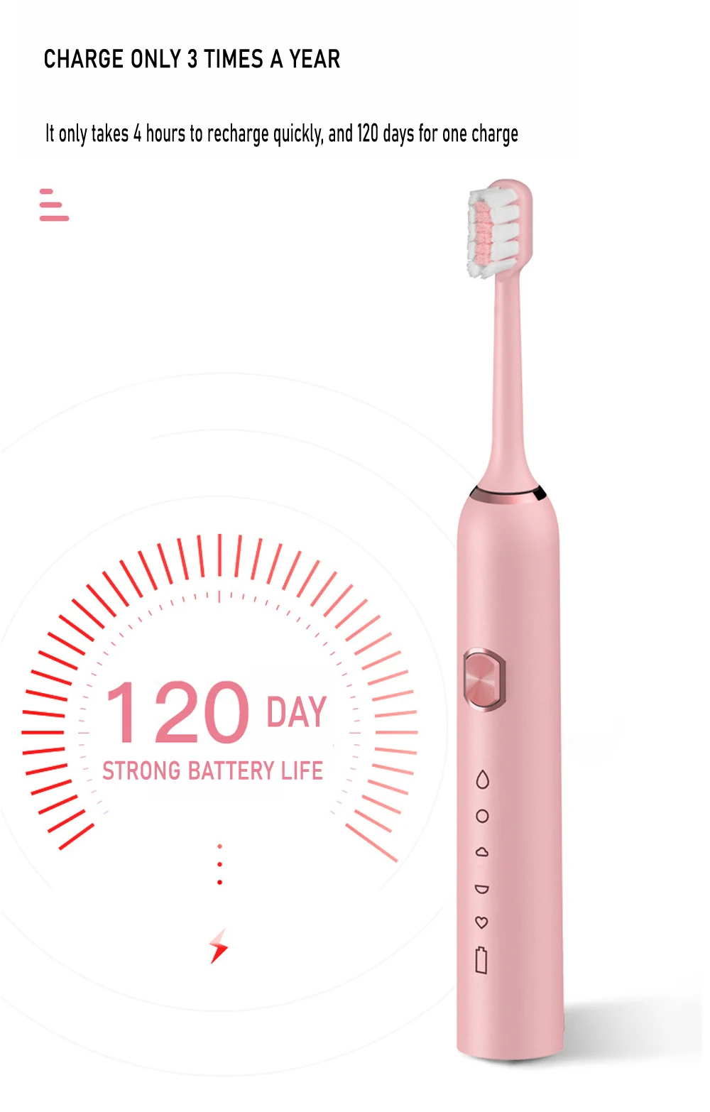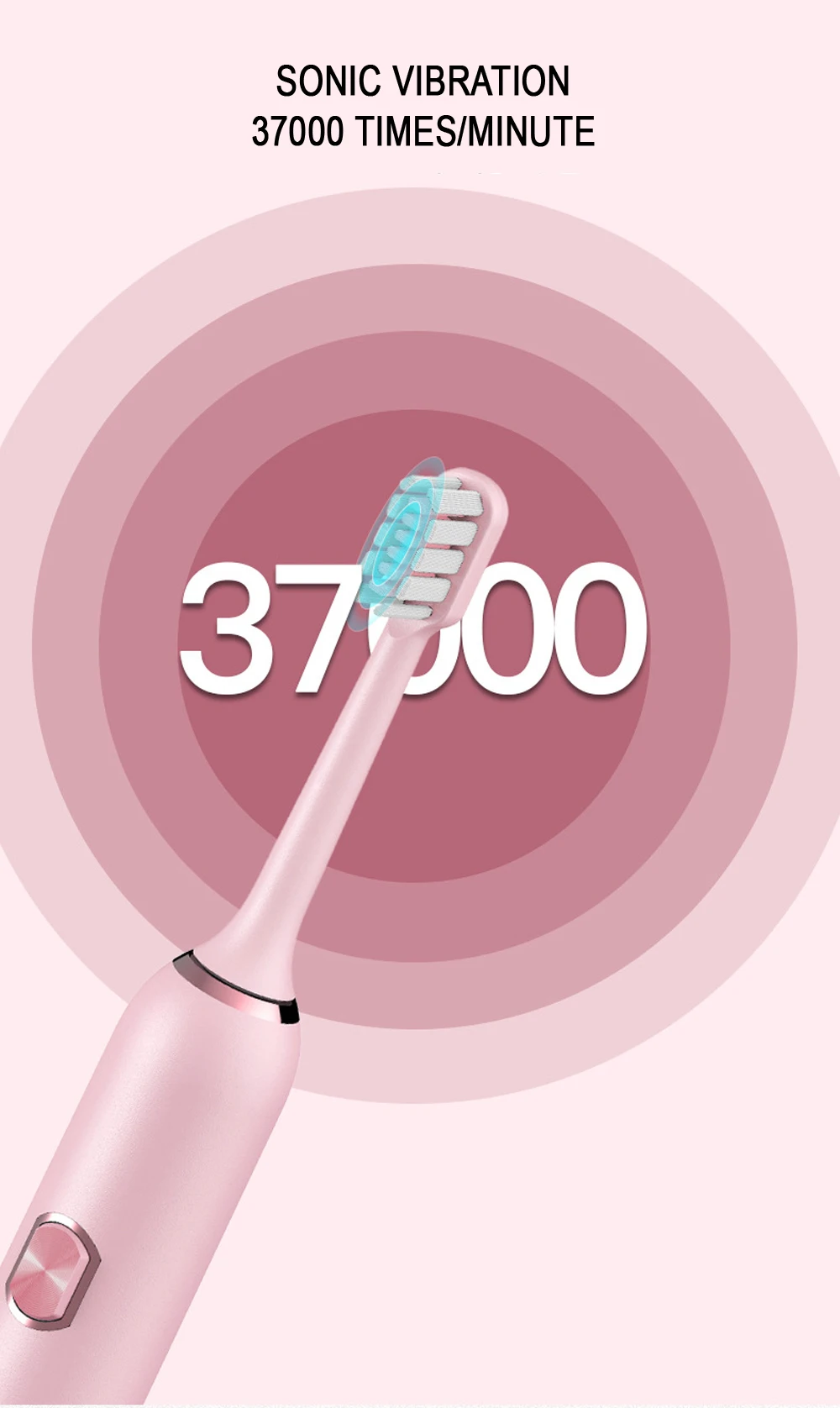 Product Features:Powerful cleaning up to 41000 strokes per minute 3 HOURS CHARGE FOR MINIUM 15 DAYS USE Gently and effectively reaches deep between teeth and along the gumline intervals to ensure thourough brushing in four quadrants IPX-7 waterproof to be used at bath and shower Long battery Ilife, supported by USB charging , safe and easy auto shut off after full charge , compatible with any power source Tooth-waved bristles made with nylon , to suit teeth topography for through cleaning of gums and hard to reach areas Material: ABS / TPE / nylon bristleCharging mode: 5V-USB chargingVoltage: 3.7VPower: 0.5W Features:1. Imported food grade brush, anti-shedding, anti-scattering, rounding process2, five vibration modes clean, sensitive, massage, solve various oral problems3, body waterproof design, the body can withstand water flow washing and intrusion, base IXP7 waterproof