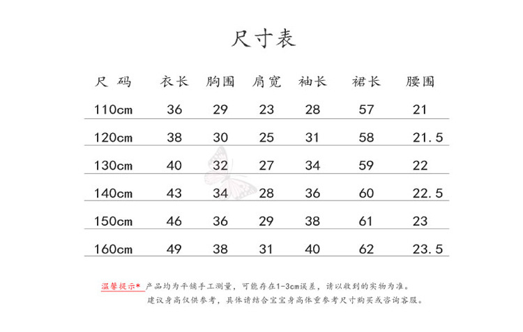Размер 6 и 7(130): длина одежды: 40 см, обхват груди: 64 см, длина юбки: 59 см,Рекомендуемая высота: 110-120 см
