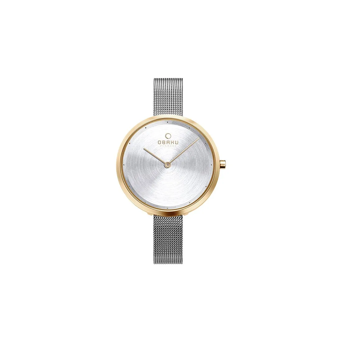 Women's quartz watch. Central hour and minute hands. Silver dial. The round case is made of polished stainless steel with IP coating in yellow gold color. The diameter of the case is 34mm. The steel bracelet is made in the technique of Milan weaving, folding clasp. Resistant to scratches sapphire crystal. Water resistance WR 30 (spray).
