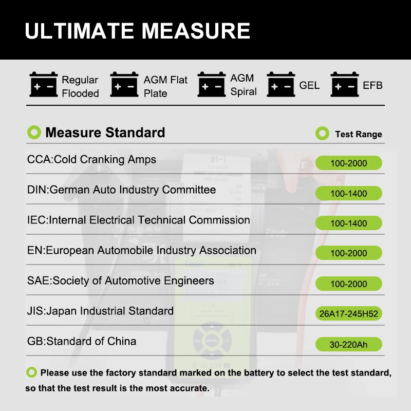 【Совместимый должны инструмент для ремонта автомобиля Owner】Professional батарея тестер применяется для автомобильных кабельных систем. В диапазон измерения является 100-2000CCA. Она охватывает все батареи Рейтинг стандартов, таких, как ОСО, BCI, CA, MCA, JIS, DIN, IEC, EN, SAE, GB. Подходит для большинства типов машинок для 12V свинцово-кислотных аккумуляторных батарей, в том числе регулярные Floded, с клапанным регулированием гель и EFB и т. д.