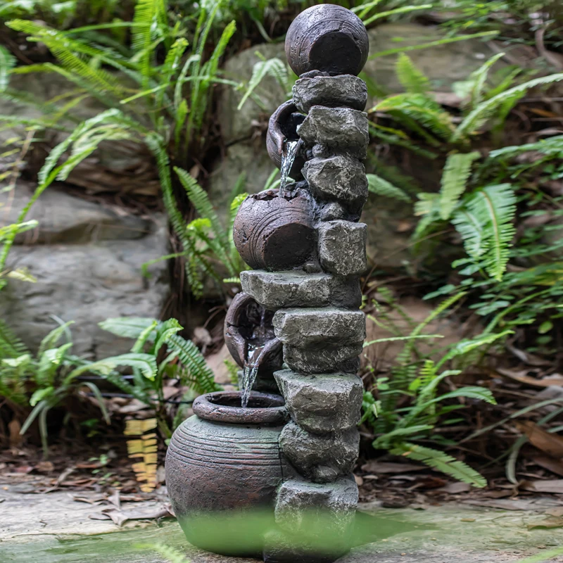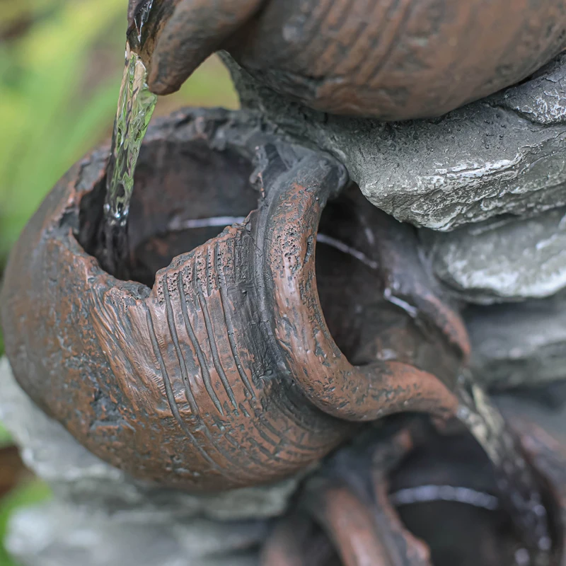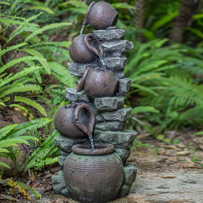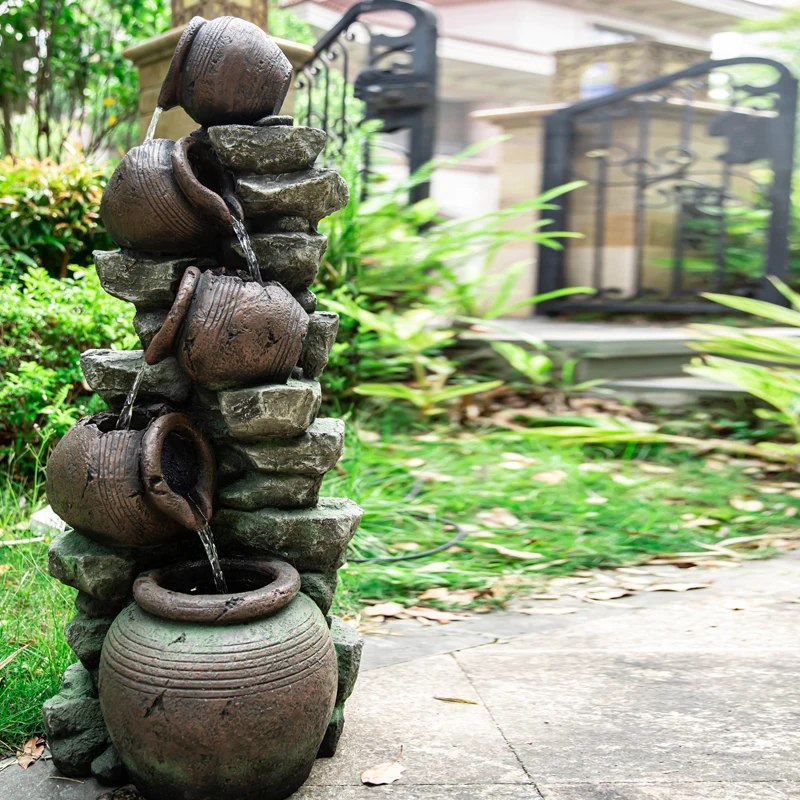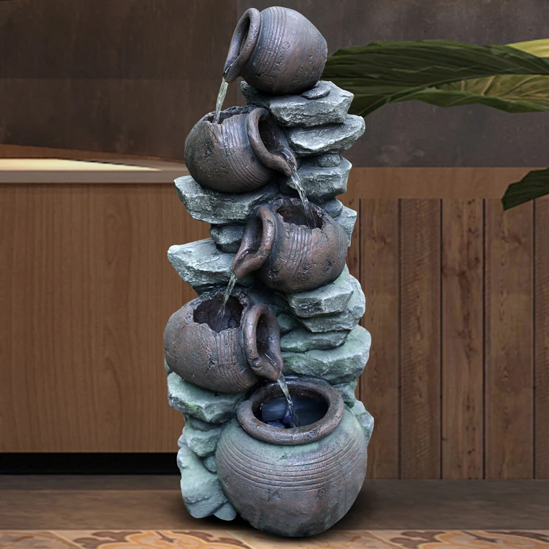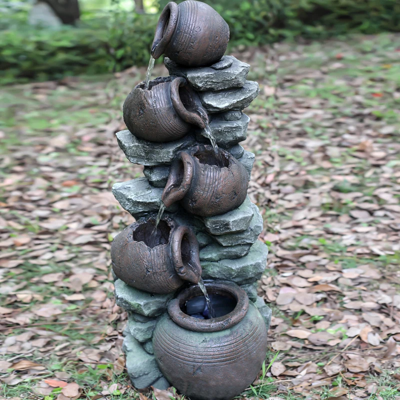 W38012919 Открытый 5 круглый Ланч-бокс кувшины горшки напольная стойка для падения воды фонтан с желтым светодиодный настенный светильник для дворика сад под открытым небом-39,37"