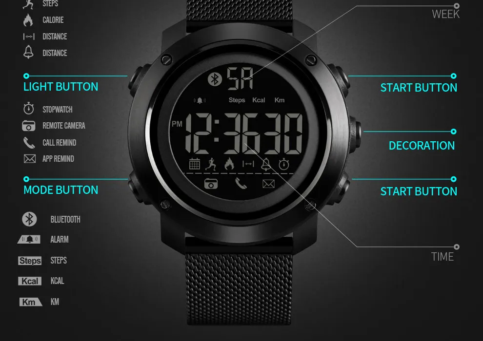 Особенности: отображение времени, дня недели, даты, спортивный шаг, спортивный пробег, расчет калорий, секунды бега, будильник, приложение, напоминание, хранение данных, будильник, напоминание о звонках, удаленная съемка, Bluetooth.