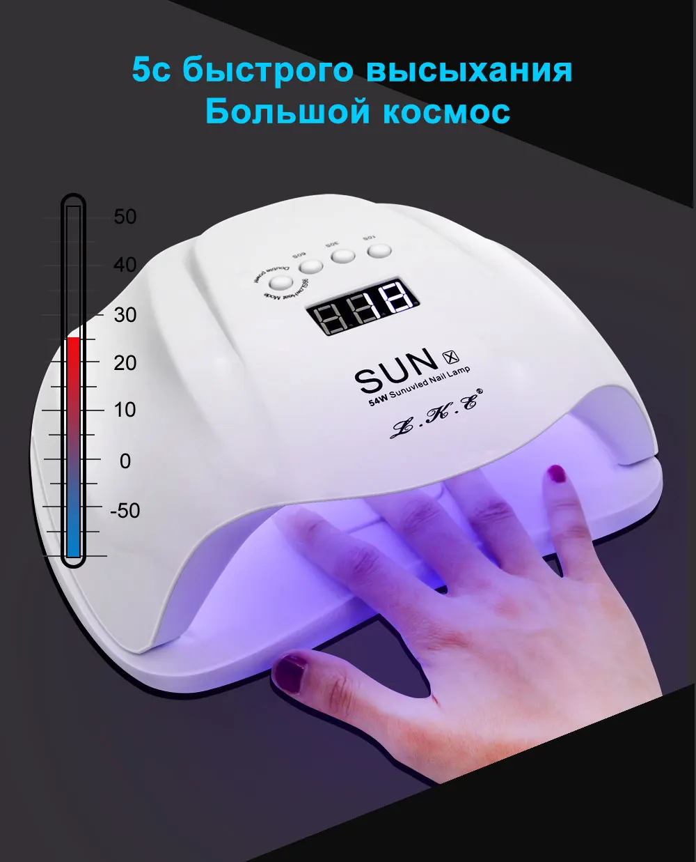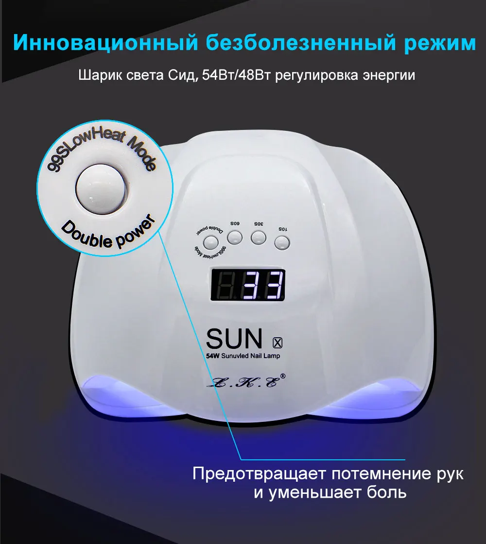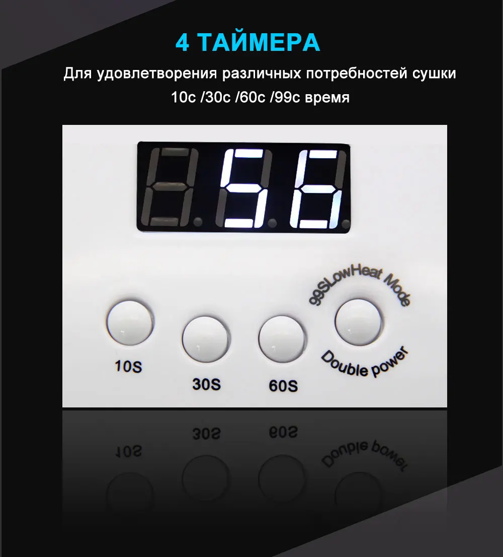 Описание: Этот продукт является профессиональной сушилкой для лака для ногтей, предоставляя вам салонный уровень ухода не только для ваших ногтей, но и для ваших ногтей. Отличается от традиционной УФ-лампы для ногтей, кроме УФ-клея для ногтей, этот нагреватель может также использоваться для сушки всех других гель для ногтей. Особенности: После запуска машины Время работы машины можно установить кнопкой синхронизации. Экран дисплея показывает соответствующее время времени, при использовании кнопок 10S, 30S, 60S для синхронизации, время отображения обратный отсчет. При использовании кнопки 99S и инфракрасного датчика для синхронизации, экран дисплея показывает время по часовой стрелке.