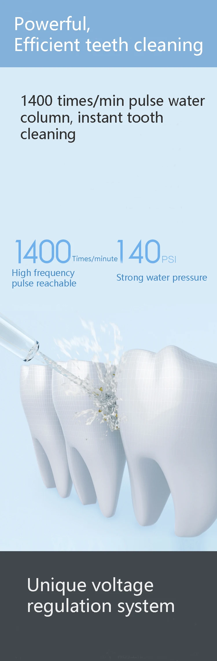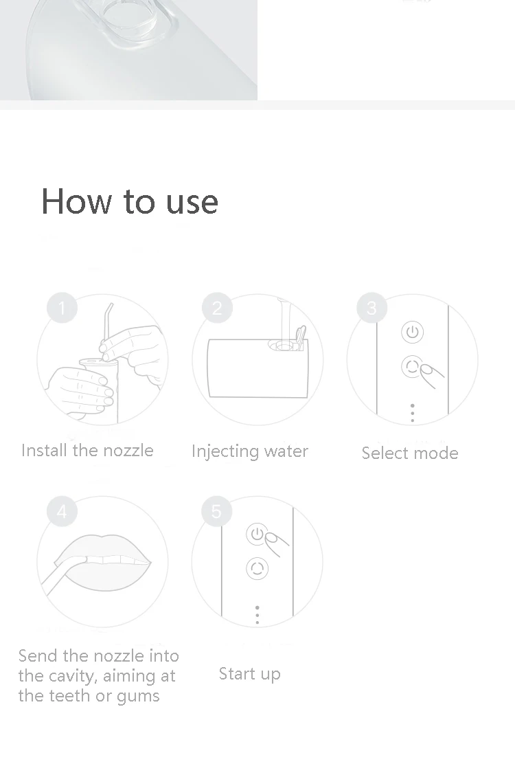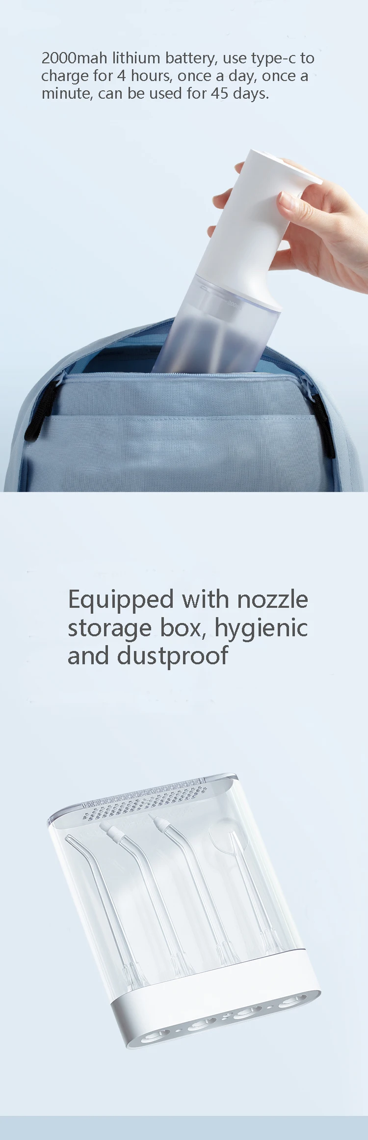 Товары Xiaomi Mijia ирригатор для полости рта Flosser Бренд Xiaomi Mijia Модель MEO701 Мощность источник USB Rechager Материал Эко из АБС-пластика Возрастная группа взрослых ортодонтических людей Warter доказательство IPX 7 Резервуар для воды 200 мл Зарядное устройство время 4 часа Применение 45 дней Посылка включает бак для воды x 1 Корпус х 1 Стандартный насадка xl Ортодонтическое сопло x 1 Карманное сопло пародонта x 1 Насадка для чистки языка x 1 Зарядный кабель типа C x 1 Контейнер для хранения сопла x 1 Руководство-1 шт. "Особенности: 1. Высокочастотный импульсный поток воды. Оснащен новой угольной щёткой, умный двигатель с постоянным магнитом с давлением воды до 140psl, который может генерировать высокочастотную пульсированную водную колонну 1400 раз/минуту 2. Уникальный давления воды система стабилизации 3,4-скоростной режим, с милым рисунком кота функция памяти, сильный режим, Стандартный режим, деликатный режим, импульсном режиме Емкость для воды большой емкости 4,200 мл 5. Умное автоматическое выключение 2 минут 6.0.6 мм стандартный диаметр сопла. Точно очистите мертвые пространства между зубами Аккумулятор емкостью 7,2200 мА · ч, срок службы батареи 45 дней ". PS: водонепроницаемый IPX 7 означает, что устройство погружено в воду в течение 1 минуты в течение 30 минут, и устройство не будет повреждено погружением в воду. Так как большое количество пара генерируется в ванне, он может войти в основной корпус зубной щетки. Не используйте его во время купания.