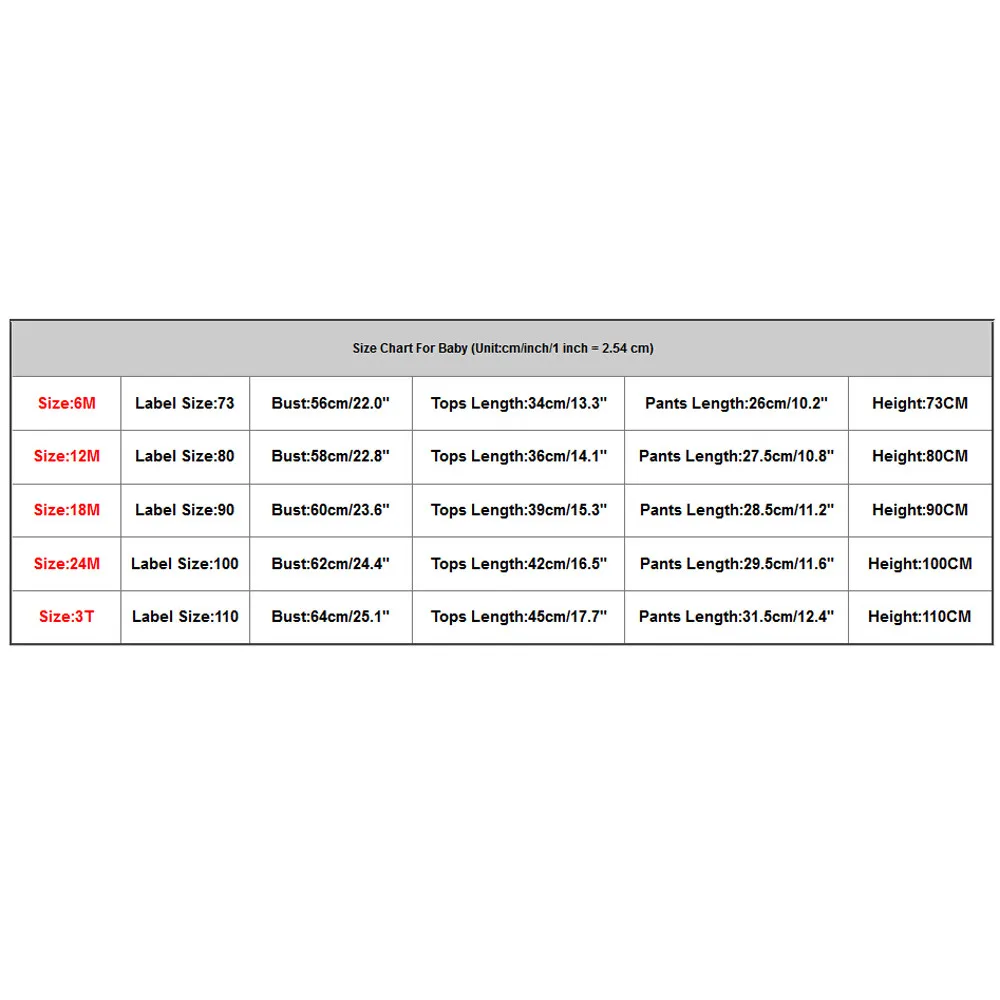 Таблица размеров для малышей (единица измерения: см/дюйм/1 Дюйм = 2,54 см) Размеры: 6М Этикетка Размеры:73 Бюст: 56 см/22,0" Топы Длина: 34 см/13,3" Брюки для девочек Длина: 26 см/10,2" Высота: 73См Размеры: 12М Этикетка Размеры:80 Бюст: 58 см/22,8" Топы Длина: 36 см/14,1" Брюки для девочек Длина: 27,5 см/10,8" Рост: 80См Размеры: 18 м Этикетка Размеры:90 Бюст: 60 см/23,6" Топы Длина: 39 см/15,3" Брюки для девочек Длина: 28,5 см/11,2" Высота: 90См Размеры: 24 м Этикетка Размеры:100 Бюст: 62 см/24,4" Топы Длина: 42 см/16,5" Брюки для девочек Длина: 29,5 см/11,6" Высота: 100См Размеры: до 3 лет Этикетка Размеры:110 Бюст: 64 см/25,1" Топы Длина: 45 см/17,7" Брюки для девочек Длина: 31,5 см/12,4" Высота: 110См