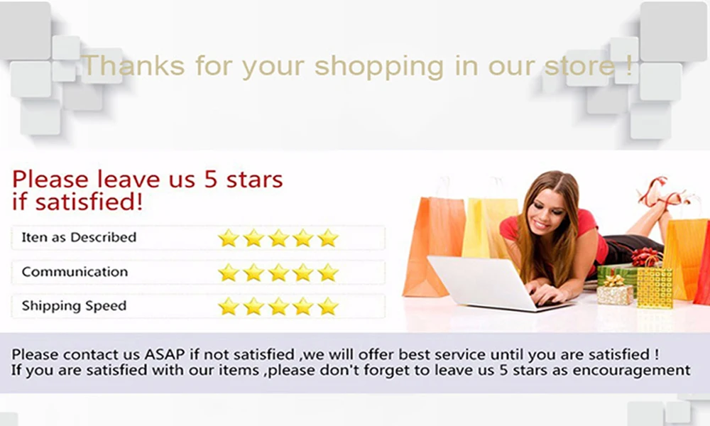 Пожалуйста, оставьте отзывы 5 звезд, если вы удовлетворены нашими товарами и услугами, ваши положительные отзывы очень полезны для других покупателей и нас. Если у вас есть какие-либо проблемы с нашими товарами или услугами,