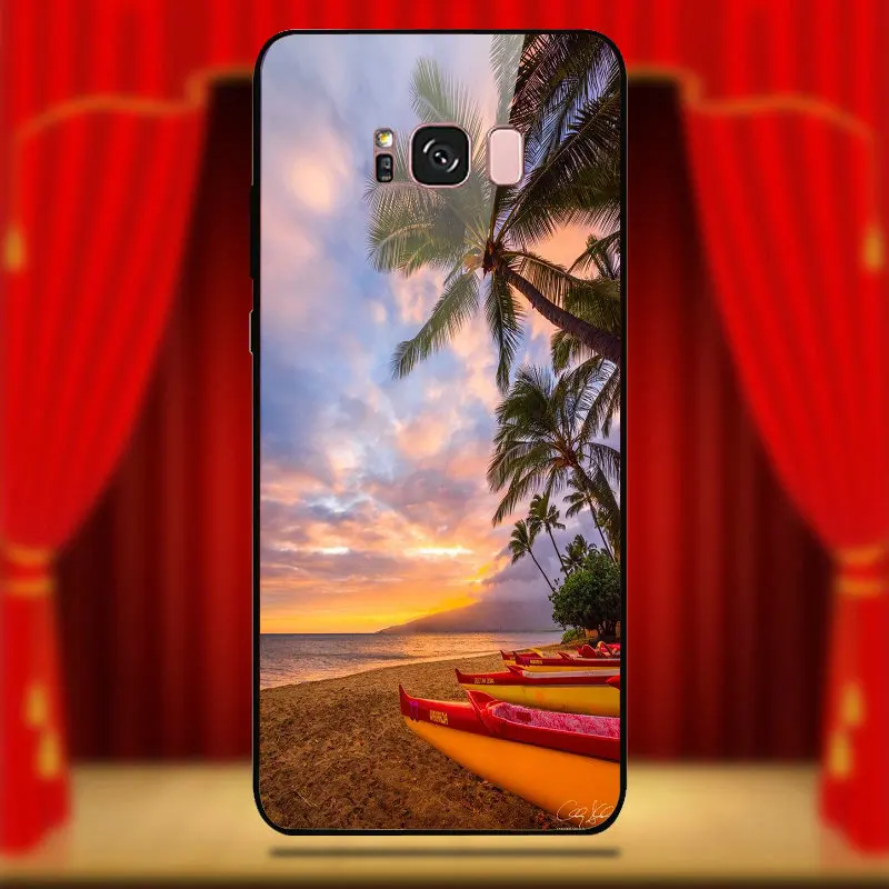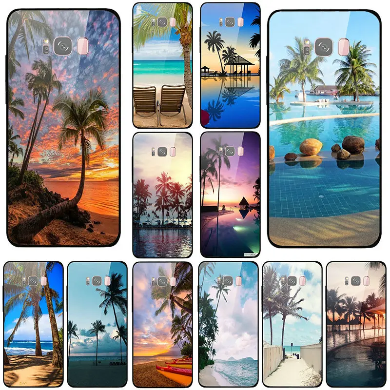 Palm Tree Hawaii Beach Tempered Glass Phone Cases Cover for Samsung Galaxy A6 A8 A8S A9S S8 S9 S10 Plus Lite Coque Bags Black Pattern Phone Shell Anti-knock Cover Protect Phone Case