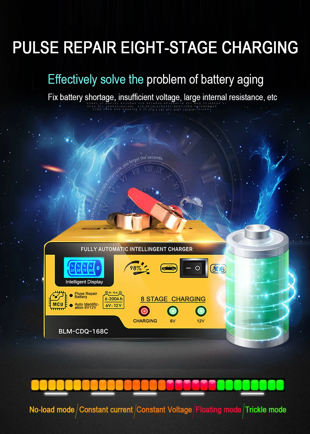 Номер товара: CDQ-168C Номинальный входной ток: 6-200 ач Рабочее напряжение: 6 В (2-7,5 в) Рабочее напряжение: 12 в 8-15 в) Номинальный входной ток: 6-200 ач Диапазон идентификации напряжения: батарея 6 в (2-75 в) Диапазон идентификации напряжения: 12 батарей (8-15 в) Диапазон рабочих температур: -30 c-50c Эффективность работы: 98% Рабочий ток: 15а Тип аккумулятора: свинцово-кислотные аккумуляторы, AGM, гель, сухие, водные аккумуляторы, аккумуляторы без свинцово-кислотных аккумуляторов (включая смачиваемый и сухой).