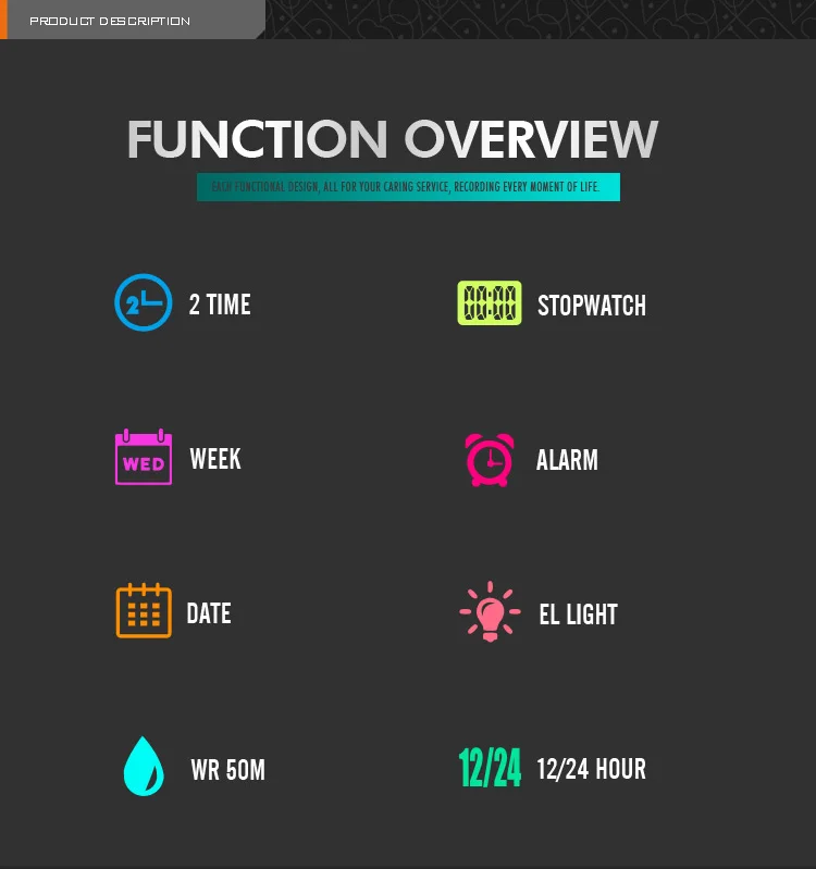 • Характеристики: Водонепроницаемость, отображение недели, шок