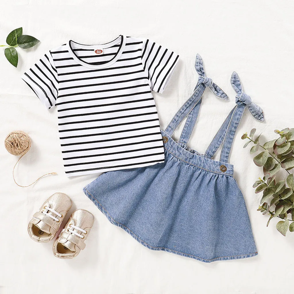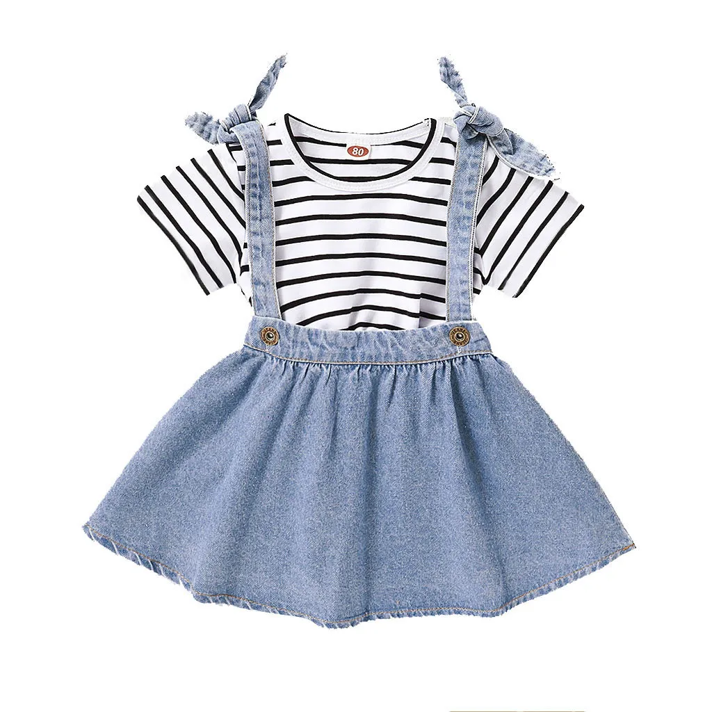 Футболка в полоску для маленьких девочек топы + джинсовые юбки на подтяжках