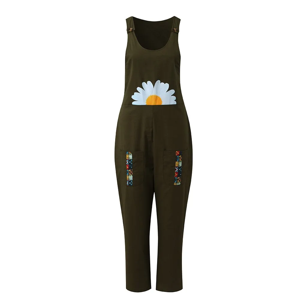 Женский Повседневный комбинезон в стиле бохо с цветочным принтом и карманами, длинный комбинезон на бретелях, комбинезон с пуговицами