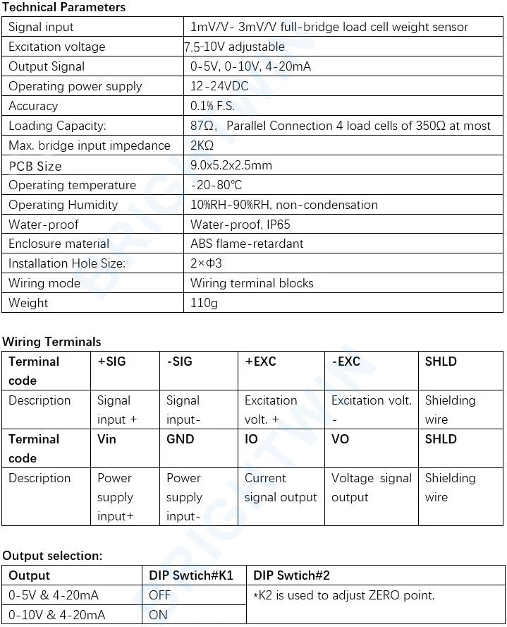 • 1 мВ/в-3мв/в полный мост нагрузки ячейки вес датчика входного сигнала • 0-5 В, 0-10 В, 4-20 мА выход. 12-24 в рабочий источник питания. • Регулируемый ремешок на 7,5-10V Напряжение возбуждения. • Нулевая точка, диапазон/полноразмерная точка регулируются. • Корпус и проволочные соединения имеют водонепроницаемый дизайн, хорошее уплотнение, подходит для суровых условий. • Проводите высокочастотную фильтрацию входного сигнала для устранения шума, высокой частоты и т. Д. Сигнала. • Использование специальных инструментов, IC усиления нагрузки, высокая надежность. • Использование емкости и индуктивности для фильтрации шума и пульсации от источника питания для устранения помех пульсации. • Имеет функцию защиты от перенапряжения, полярности, перенапряжения, перегрузки по току. • Подходит для всех типов датчиков напряжения, таких как взвешивание, натяжение и крутящий момент. • Огнестойкий прочный корпус, хорошая защита от помех. • Инновационная техника, используемая для обеспечения его долгосрочной стабильности и защиты от помех в практическом применении и отвечает требованиям промышленного применения.