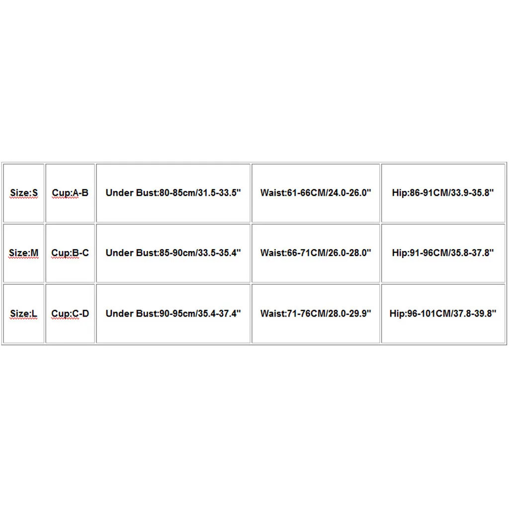 Размер Чашка Под грудью Талия Бедра S A-B 80-85 см/31,5-33,5" 61-66 см/24,0-26,0" 86-91 см/33,9-35,8" М B-C 85-90 см/33,5-35,4" 66-71 см/26,0-28,0" 91-96 см/35,8-37,8" L C-D 90-95 см/35,4-37,4" 71-76 см/28,0-29,9" 96-101 см/37,8-39,8"