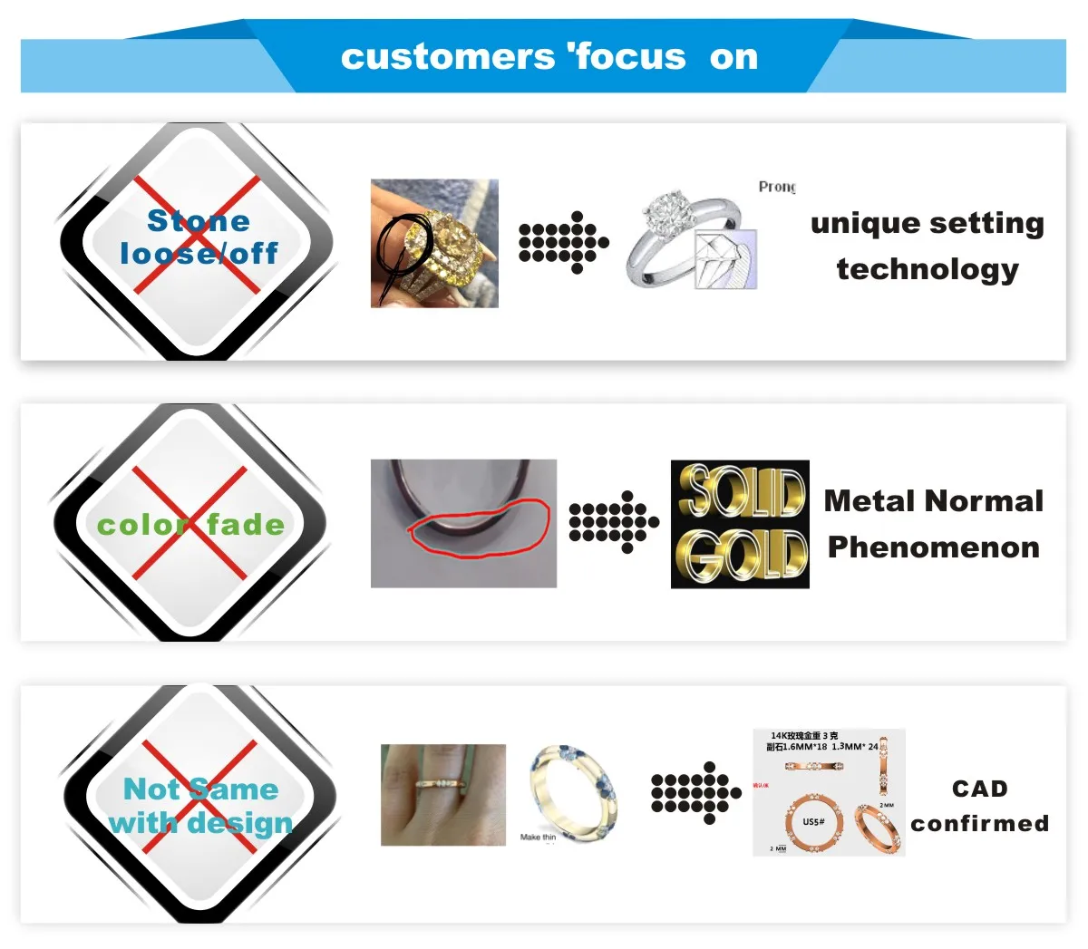 Предпродажное обслуживание клиентов 1. Завод производит напрямую, поэтому цена изменится в зависимости от количества заказа. 2. Мы можем сделать частную настройку или принять заказы OEM, ODM. 3. У нас есть профессиональный и уникальный дизайнер для получения приема, чтобы обеспечить удовлетворение каждого клиента. Послепродажное обслуживание клиентов 1. Вы можете воспользоваться услугой уборки ювелирных изделий в течение всего срока службы! 2. Когда вы получите товар, пожалуйста, проверьте в первый раз, если есть какие-либо проблемы с качеством (за исключением логистических повреждений), вы можете отправить его нам для ремонта или местного ремонта за наш счет. 3. В любое время мы предоставляем услугу бесплатного ремонта ювелирных изделий, но расходы за фрахт несет покупатель. Примечание: 1. Пожалуйста, обратите внимание, что небольшие неровности и вариации в рукоделии или естественных характеристиках, а также внутренние посторонние включения, видимые или иные, в цветных драгоценных камнях уникальны и имеют индивидуальный вид изделия. Эти характеристики рассматриваются как часть характера изделия и не должны считаться дефектом. 2. Все товары на заказ не принимают возвраты по любой причине. 3. Все возвращаемые товары должны быть в полном, неиспользованном и оригинальном состоянии, в том числе в оригинальной упаковке, в сопровождении с подтверждением покупки. Если возвращенный товар не соответствует вышеуказанным требованиям, мы не обработаем ваш возврат или обмен.
