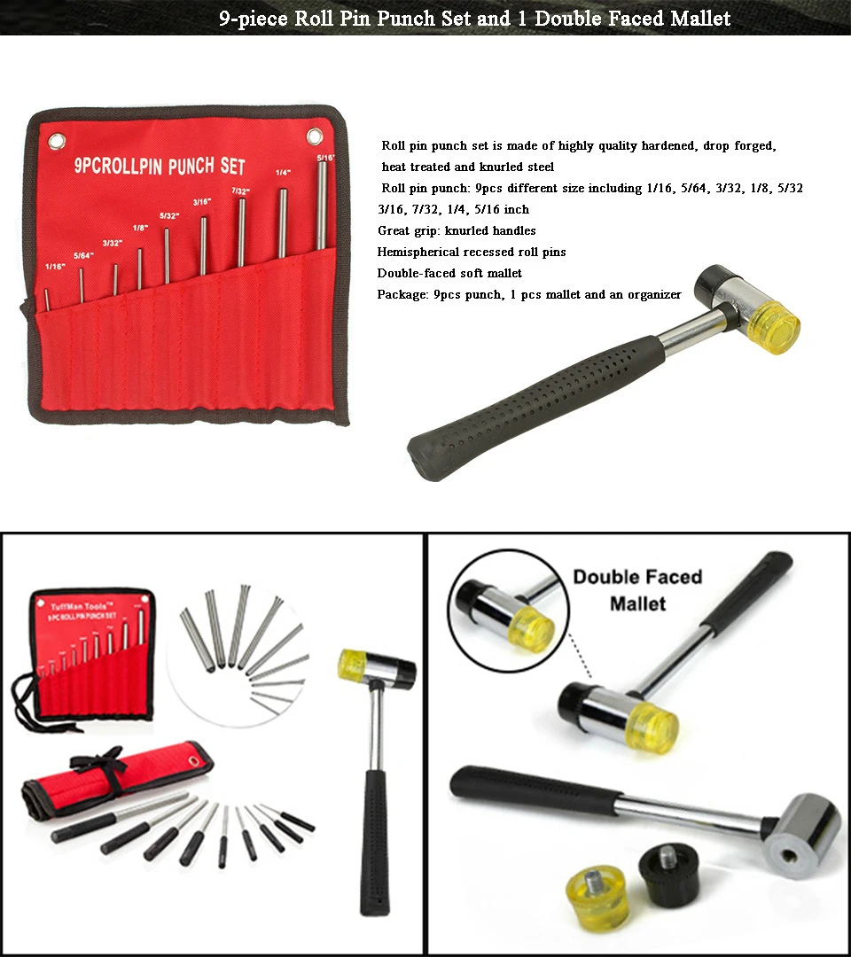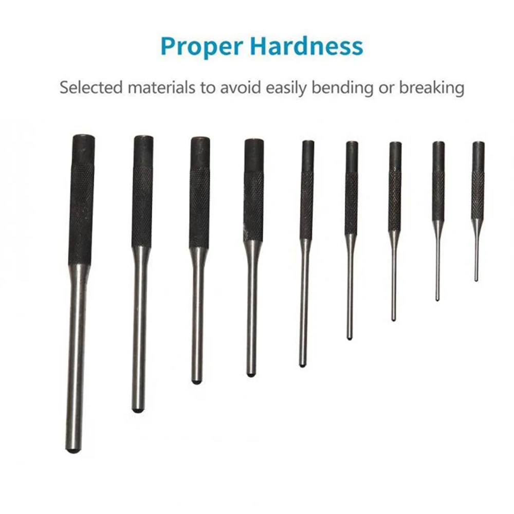 3. Полный комплект: набор пробойников для штифтов имеет 9 разных размеров, включая 1/16 дюймов, 5/64 дюймов, 3/32 дюймов, 1/8 дюймов, 5/32 дюймов, 3/16 дюймов, 1/4 дюйма, 5/16 дюйма.