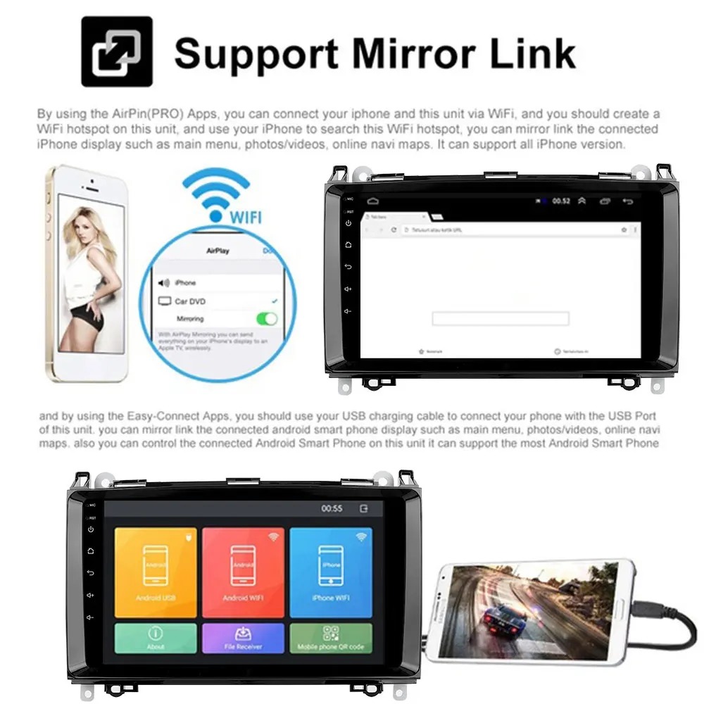 * Специальный автомобильный специальный плеер, установка без ошибок, оригинальная автомобильная линия подключена, установка проста* Многофункциональный плеер с Bluetooth, может отвечать на звонки с помощью Bluetooth* С системой Android, Wi-Fi доступ в Интернет, Бесплатная загрузка приложений* С gps-навигацией, чтобы сделать ваше путешествие более плавным* Поддержка заднего вида (Дополнительная камера), видеовходОсновная функция: