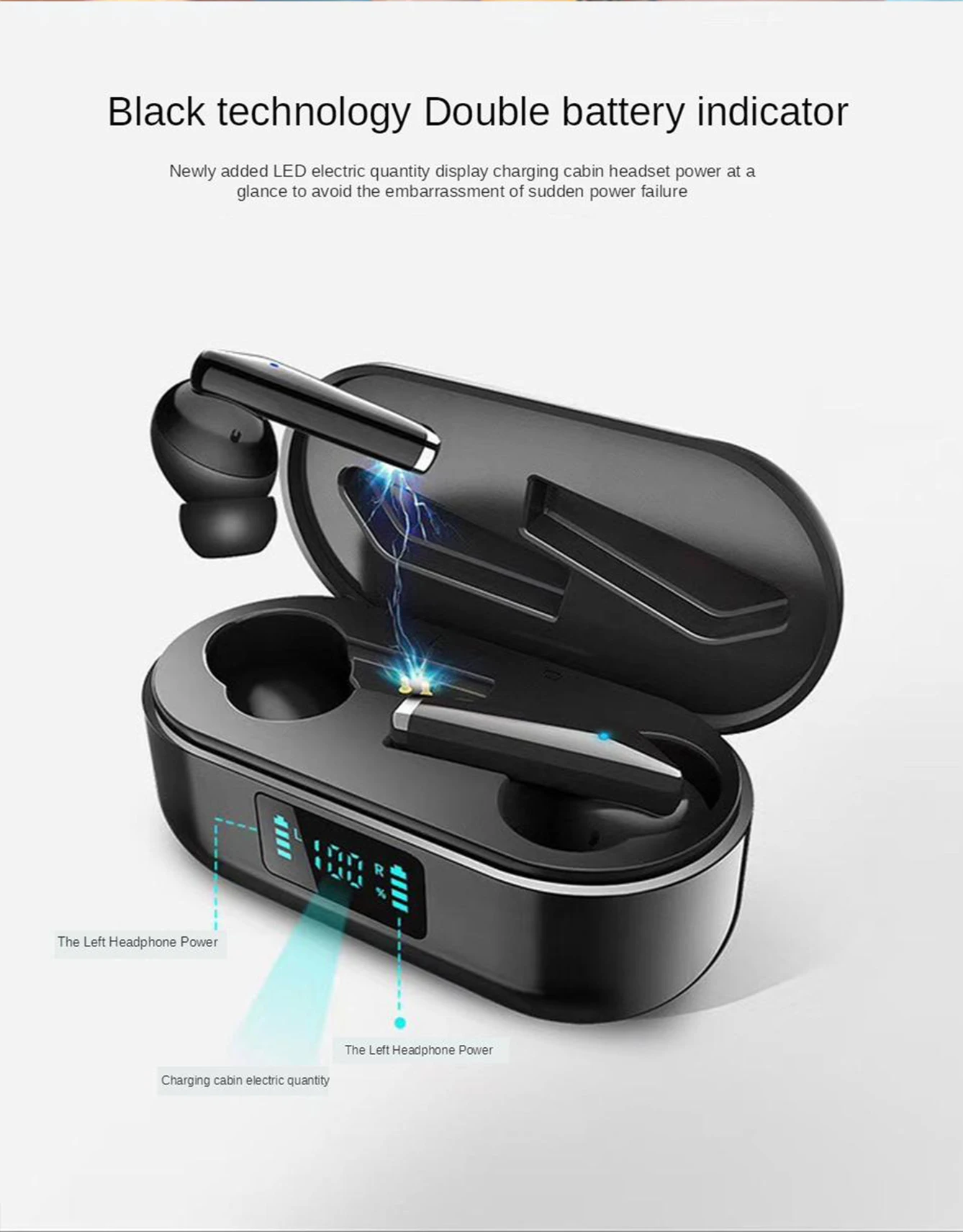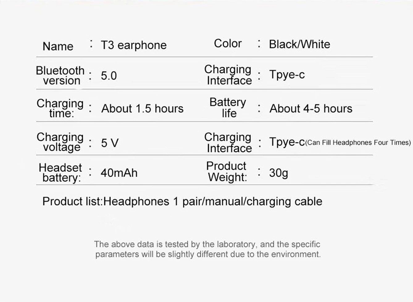 Название модели: T3 Версия Bluetooth: Новый V5.1 Цвет: черный/белый Интерфейс зарядки: Tpye-c Быстрая зарядка Время зарядки: около 1,5 часов Время воспроизведения музыки: около 3-4 часов Срок службы батареи: около 4 ~ 5 часов Интерфейс зарядки: Tpye-c Аккумулятор гарнитуры: 40 мАч Аккумулятор для зарядки: 400 мА · ч (может заряжать наушники 4 раза)