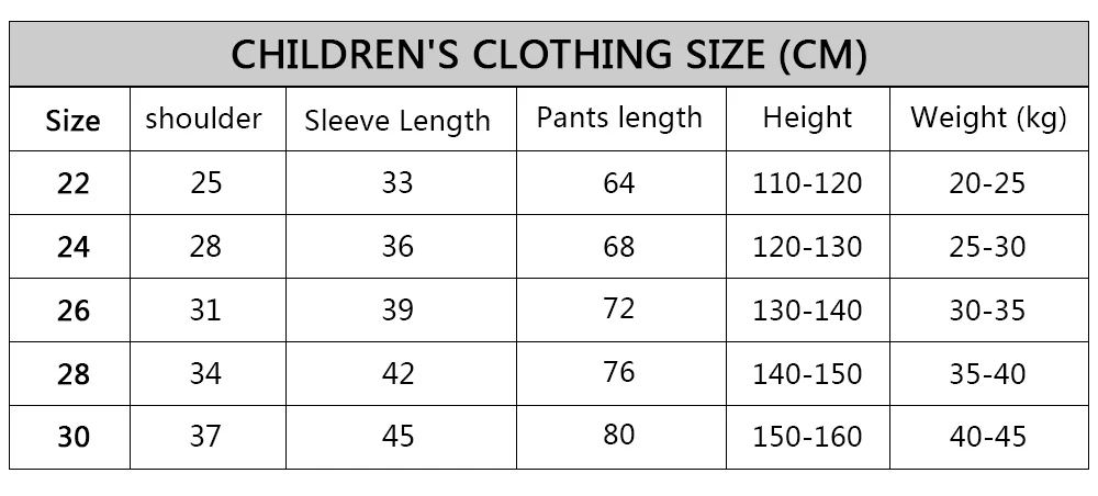 Size: 22, shoulder : 25cm , Pants length : 64cm , height: 110-120 cm, weight: 20-25 kg Size: 24, shoulder : 28cm , Pants length : 68cm , Height: 120-130cm, Weight: 25-30kg Size: 26, shoulder : 31cm , Pants length : 72cm , height: 130-140 cm, weight: 30-35 kg Size: 28, shoulder : 34cm , Pants length : 76cm , Height: 140-150cm, Weight: 35-40kg Size: 30, shoulder : 37cm , Pants length : 80cm , Height: 150-160 cm, Weight: 40-45 kg