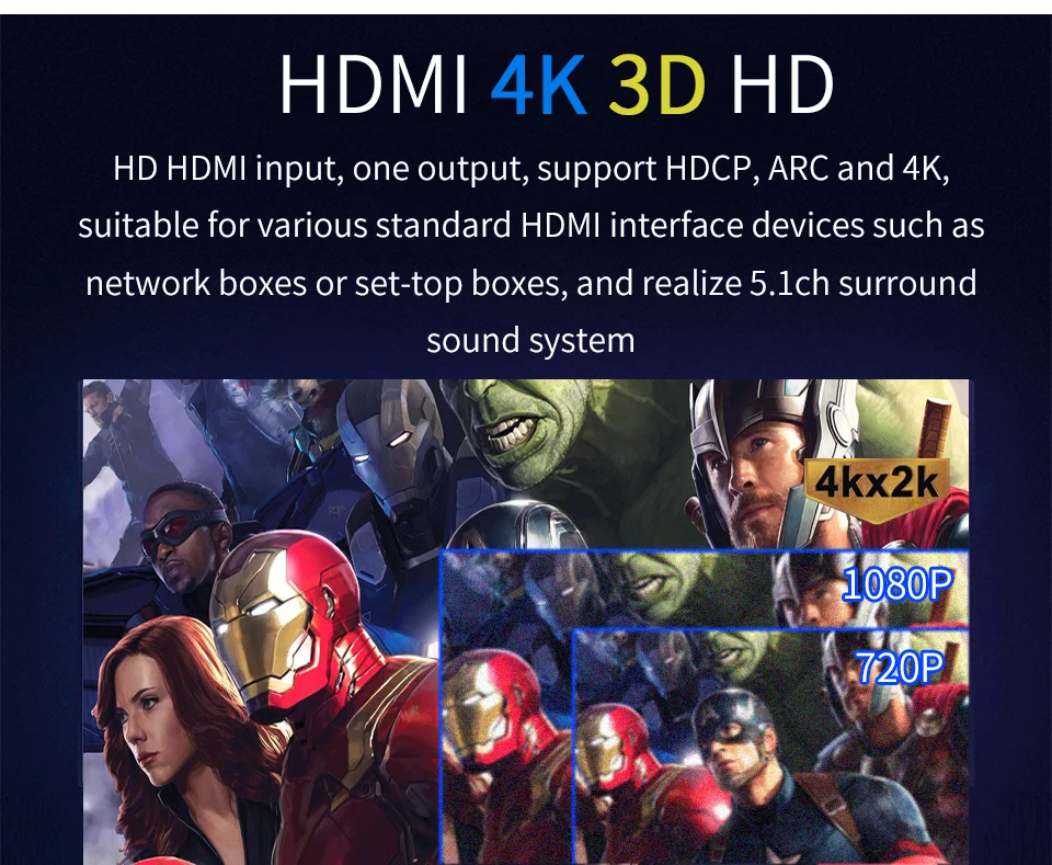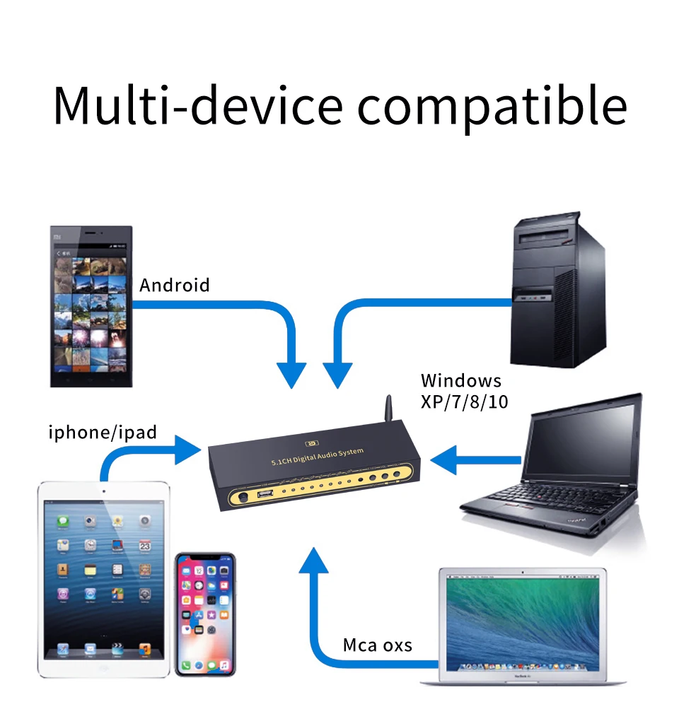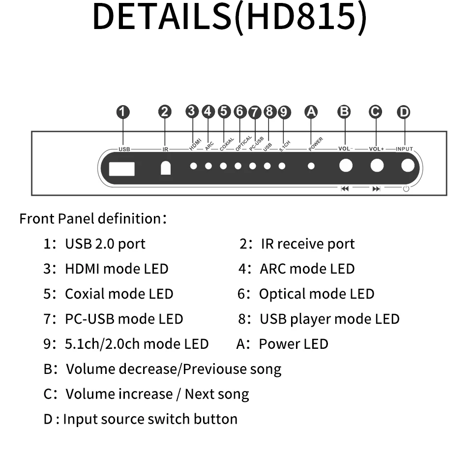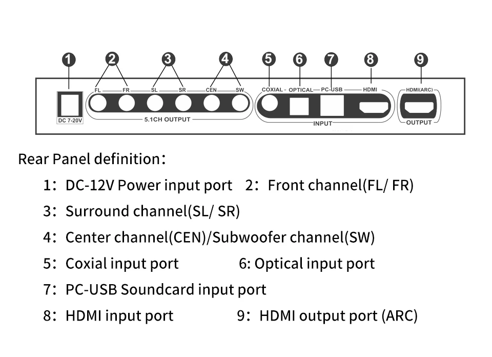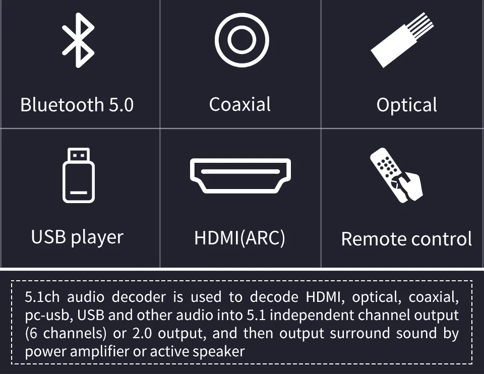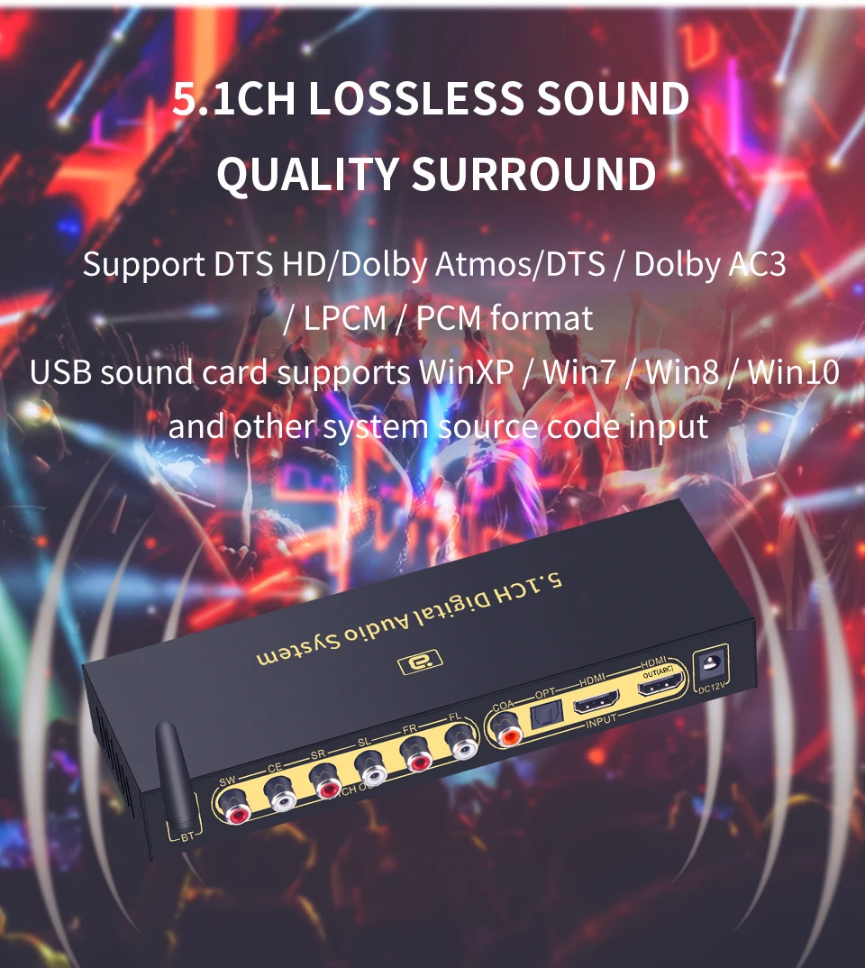 Характеристика: 1: поддерживает один вход HDMI, один коаксиальный вход, один оптический вход, один вход PC-USB, один вход AUX, один вход USB 2,0. Вы можете переключать различные источники сигнала в случайном порядке с помощью кнопки или пульта ДУ. 2: поддерживает один выход HDMI(ARC), один оптический выход, один Coxial выход, один аналоговый аудиовыход 5,1ch RCA, все аудиовыход одновременно. PS: пожалуйста, используйте 19-основной Стандартный HDMI кабель 3: все источники сигнала (HDMI/ARC/COXIAL/OPTICAL/PC-USB/USB) могут декодировать на 5.1ch выход, это аудио декодер системы. 4: HD820 поддерживает Bluetooth 5,0 аудио приемник.(HD815 не поддерживает ed) 5: Разрешение HDMI до 4K x 2K @ 30hz, поддержка 3D 6: HD815 Поддерживаемые аудио фермы: DTS, DTS-ES, AC3, WAV, FLAC, APE, HDCD, AAC, WMV, MP3, M4A и т. Д. HD820 поддерживает аудио фермы: DTS HD, DTS, DTS-ES, Dolby Atmos, AC3, WAV, FLAC, APE, HDCD, AAC, WMV, MP3, M4A и т. Д. 7: поддержка 5. Режим вывода 1ch/2.0ch, FL/FR активный, когда выходной режим 2.0ch. 8: кнопка поддержки или ИК-пульт дистанционного управления источником входного сигнала. 9: Поддержка ИК-регулировки объема 10: функция отключения памяти, автоматически переключается на последний используемый сигнальный канал, Память передачи USB до выключения питания. 11: пользователи могут обновить прошивку, когда производители обновили. 12: использование внешнего адаптера питания постоянного тока 12 В/1 А, широкое напряжение может использоваться DC (5-19 в) источник питания PS: если вам нужен настоящий аудио-тест 5.1CH, пожалуйста, свяжитесь со службой поддержки клиентов.