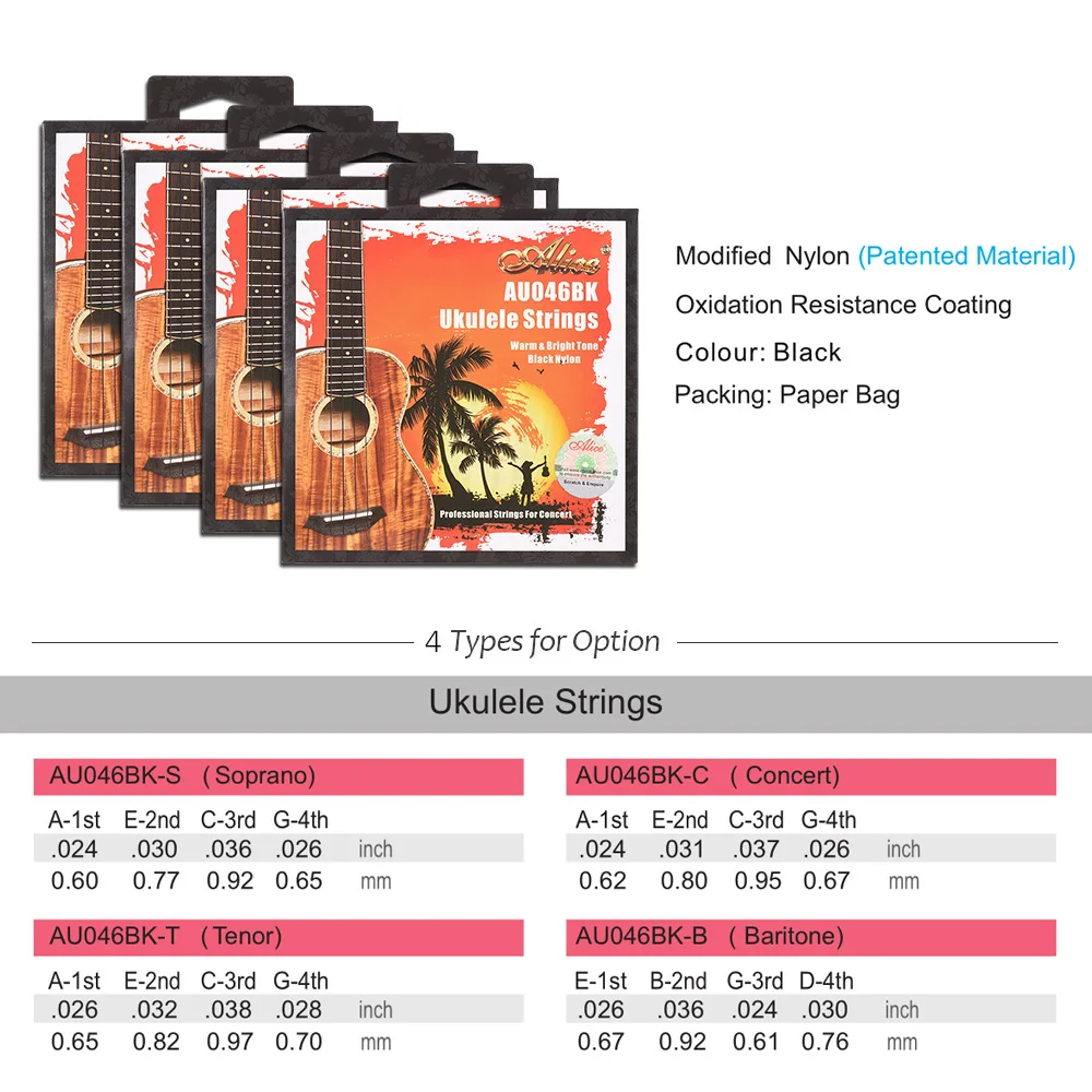 4 вида струн на выбор: струны сопрано Уке/струны концерта Уке/струны тенора Уке/струны баритон Уке.