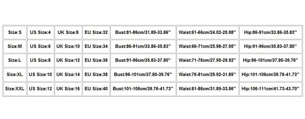 Размеры Размер США Размер Великобритании Размер ЕС Бюст Талия Бедра S 4 8 32 81-86 см/31,89-33,86 дюйма 61-66 см/24,02-25,98 дюйма 86-91 см/33,86-35,83 дюйма М 6 10 34 86-91 см/33,86-35,83 дюйма 66-71 см/25,98-27,95 дюйма 91-96 см/35,83-37,80 дюйма L 8 12 36 91-96 см/35,83-37,80 дюйма 71-76 см/27,95-29,92 дюйма 96-101 см/37,80-39,76 дюйма XL 10 14 38 96-101 см/37,80-39,76 дюйма 76-81 см/29,92-31,89 дюйма 101-106 см/39,76-41,73 дюйма XXL 12 16 40 101-106 см/39,76-41,73 дюйма 81-86 см/31,89-33,86 дюйма 106-111 см/41,73-43,70 дюйма