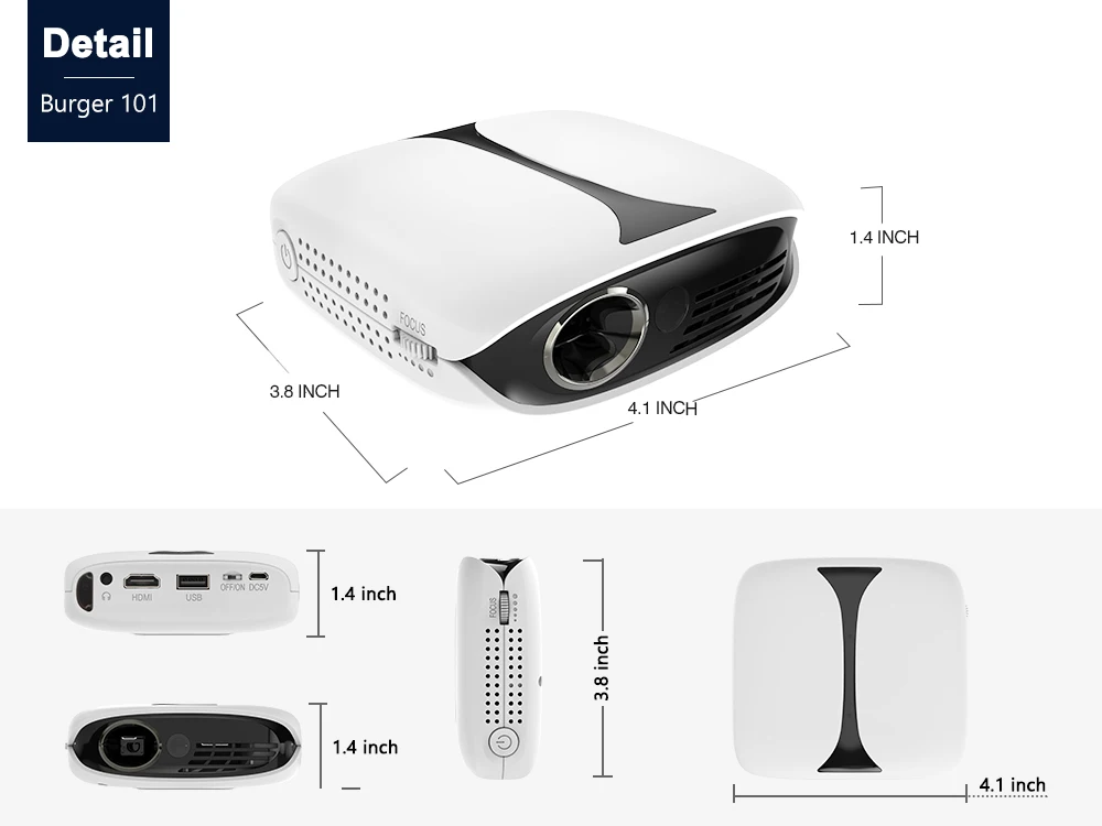Мультимедийное подключение. Мини-проектор vanyo Burger A101MQ имеетHDMI-совместимый, USB и аудиовыход, что позволяет подключаться кНоутбук, смартфон, планшет, ТВ-приставка, ТВ-приставка и USB флеш-накопитель.