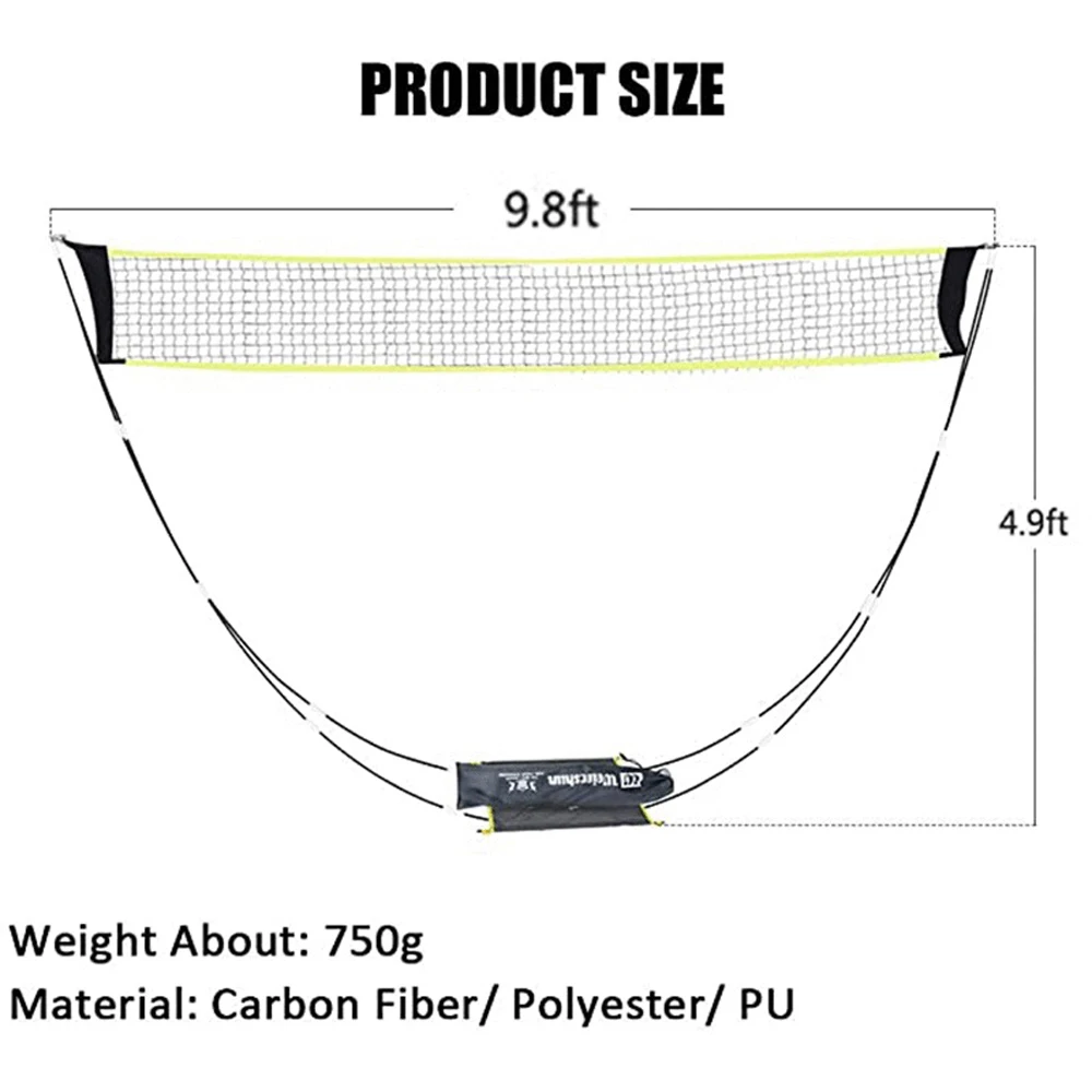 Этот складной набор для бадминтона изготовлен из углеродного волокна, полиэстера, ПУ и нержавеющей стали, обеспечивает практичные сетки и твердые металлические крючки