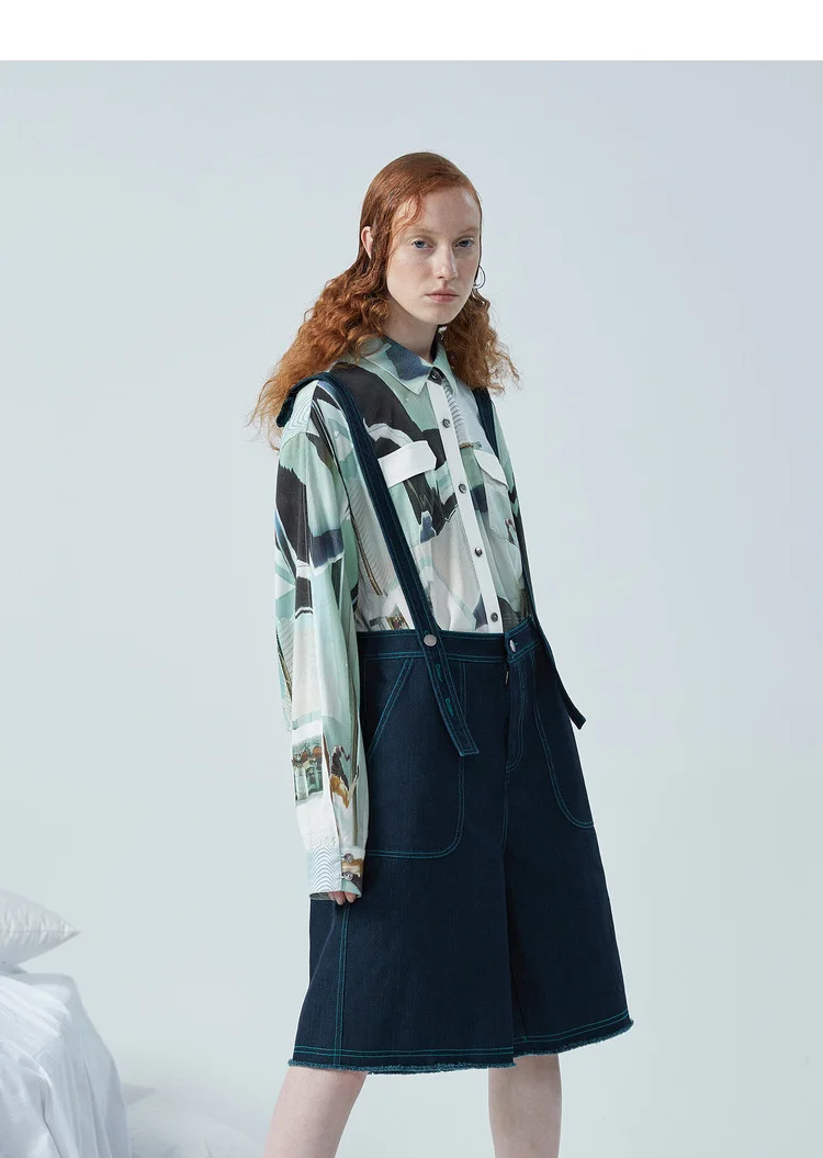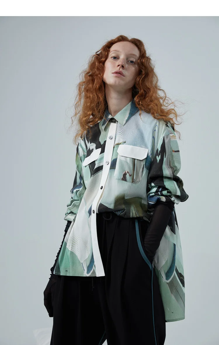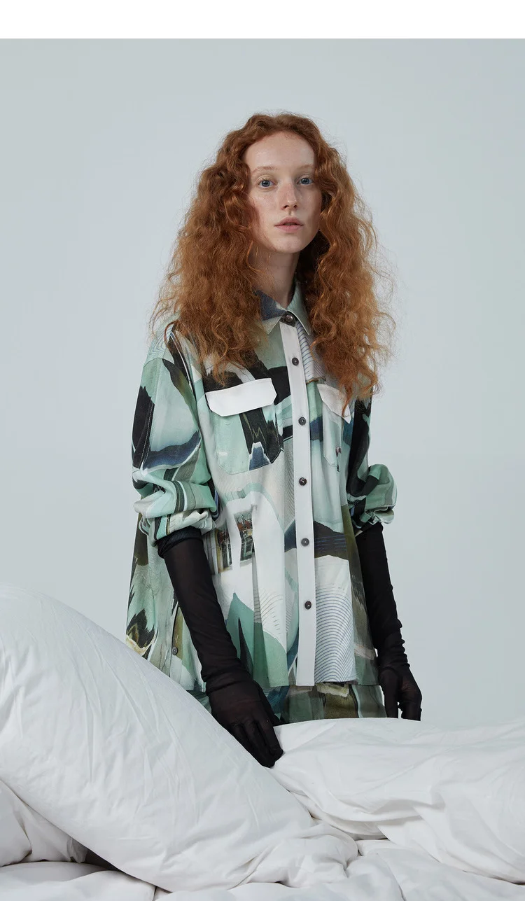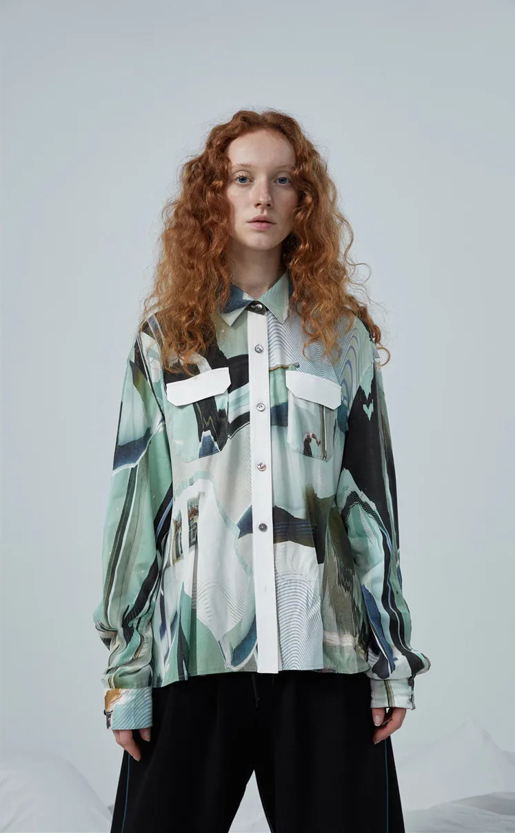 Бесплатная доставкаОригинальный дизайн, женские весенние Рубашки в Корейском стилеКрасивые повседневные свободные длинные женские рубашки с абстрактным принтомCУдобныйРубашки с медным аммиаком.