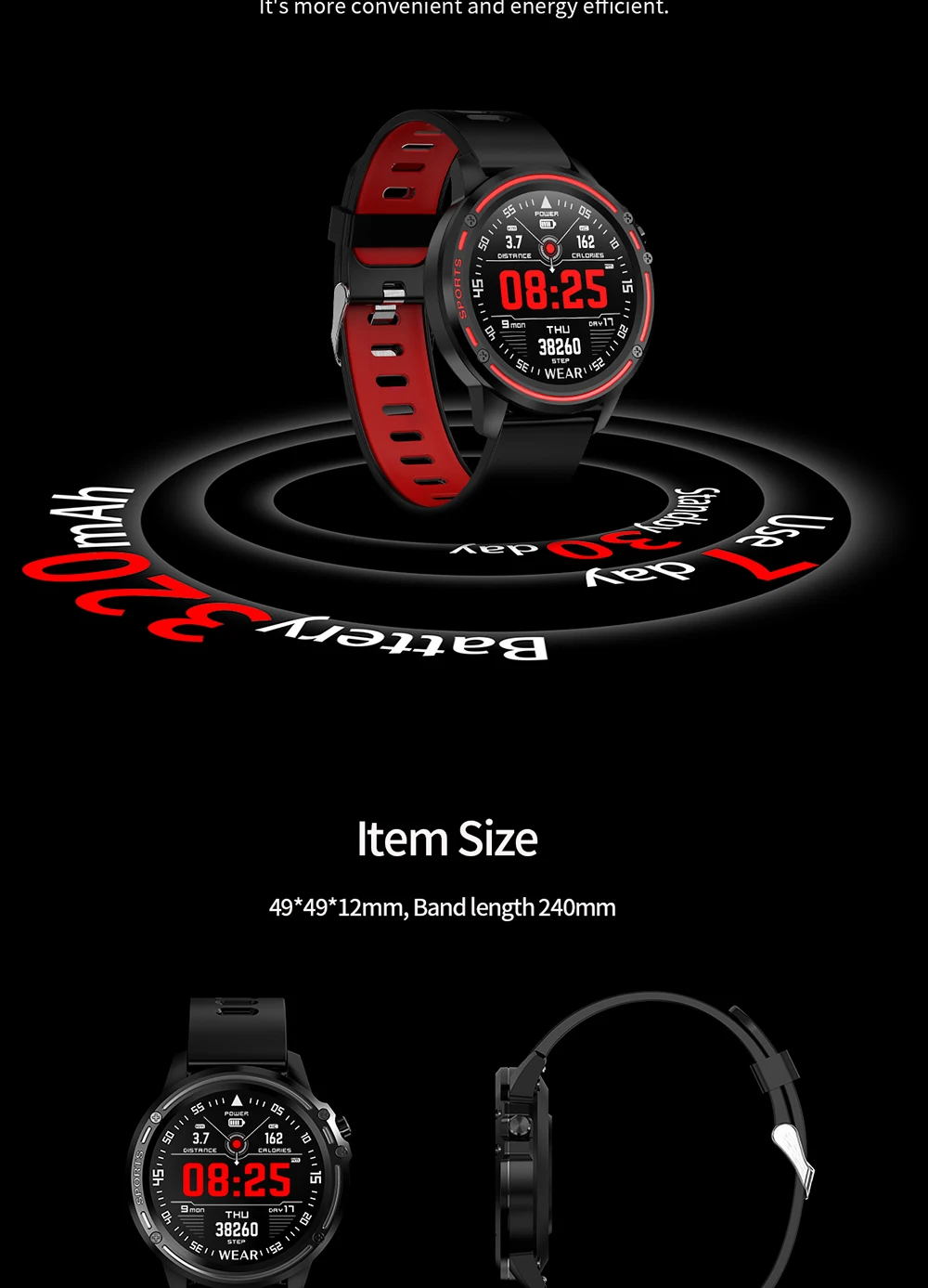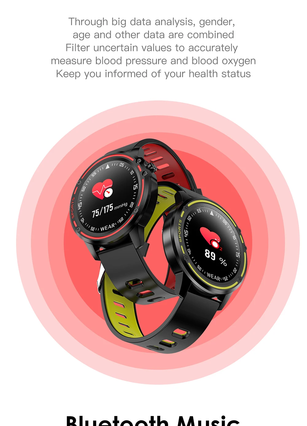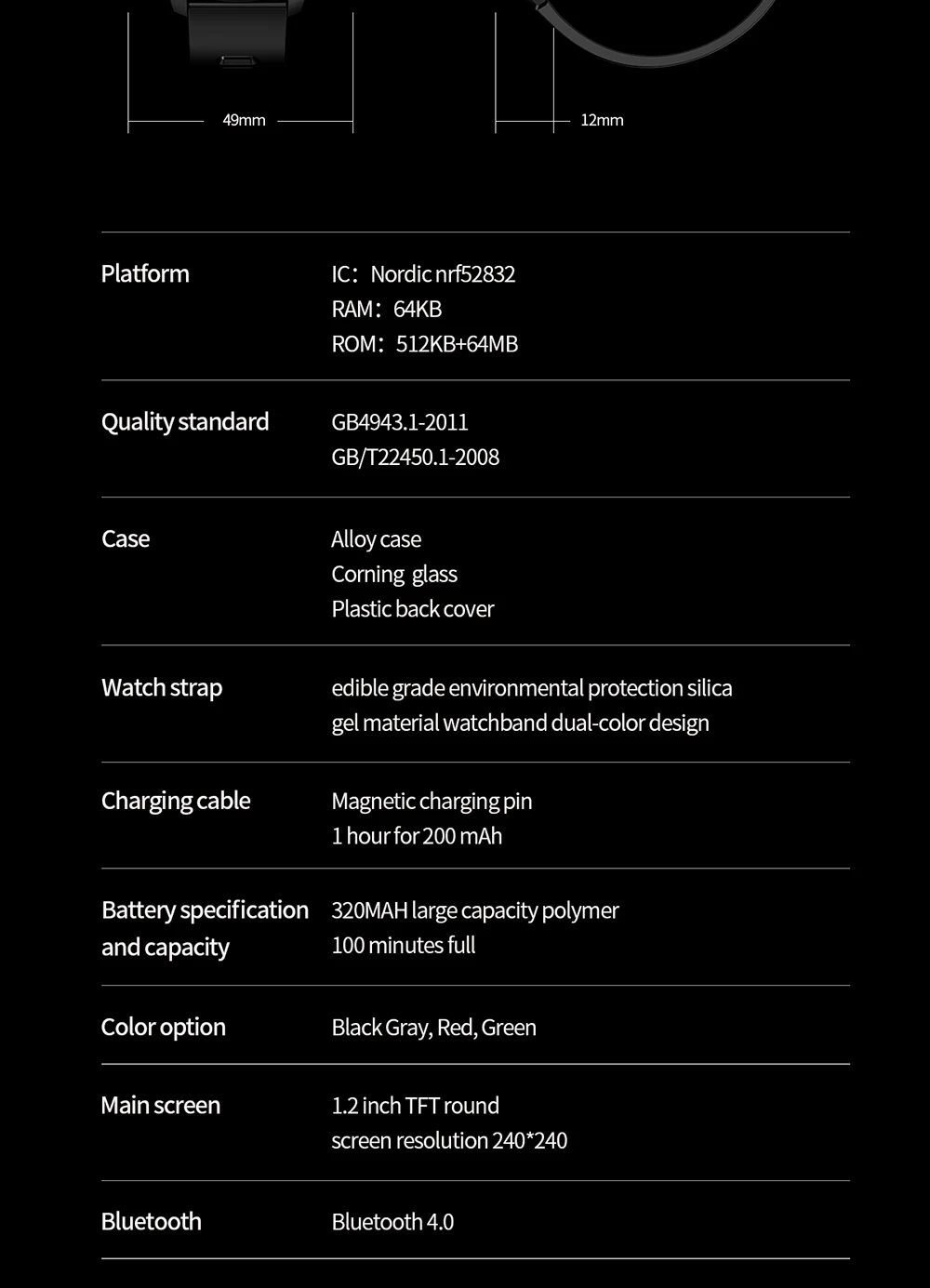Спецификация умных часов Основной пункт продажи продукта является водонепроницаемым IP68, 1,2 дюйма full fit HD круглый экран, 7 дней автономной работы Основные характеристики: пульсометр ЭКГ, кислород в крови, счетчик, оплата, погода, секундомер, управление музыкой, Bluetooth фото Платформа Norway Nordic nrf52832 Оперативная память: 64 КБ, ПЗУ: 512кб + 64 Мб Моделирование продукта спортивные часы для здоровья Стандарт реализации GB4943.1-2011; ГБ/T22450.1-2008 Справочный Размер машины "49*49*12 мм, длина ремня 240 мм Вес машины с одной головкой 60 г Чехол из сплава, армированное зеркало из минерального стекла, Пластиковая Задняя крышка. Ремешок Пищевой Экологически чистый силиконовый ремешок, двухцветный дизайн Мощное магнитное зарядное устройство, зарядка 200 мА в течение 1 часа. Экологически чистые продукты, Сертифицированные CE Основной экран 1,2 дюйма TFT круглый экран разрешение 240*240 Сенсорный экран полностью подходит для сенсорного экрана Bluetooth push-вызов, SMS, WeChat, QQ синхронизация содержимого сообщения (170 стран и региональных языков полный шрифт) Обнаружение сердечного ритма поддержка 24-часового контроля сердечного ритма Шагомер, Спортивная калория, потребление калорий, запись пробега упражнений Мониторинг сна объективно и научно записывает и анализирует ваш сон, автоматически открывается с 9:00 каждую ночь до 9:00 на следующее утро Напоминание о звонке поддержка отклонения вызова Функция Bluetooth и версия Bluetooth 4,0 Размер батареи и емкость 320MAH большой емкости полимера, 100 минут полный Поддержка вибрационного двигателя Часы могут отображать несколько языков:, английский, японский, русский, испанский, французский, итальянский, немецкий, португальский, греческий, голландский, польский, китайский Языковые пакеты APK:, традиционный китайский, английский, русский, испанский, украинский, французский, японский, итальянский, немецкий, Китайский