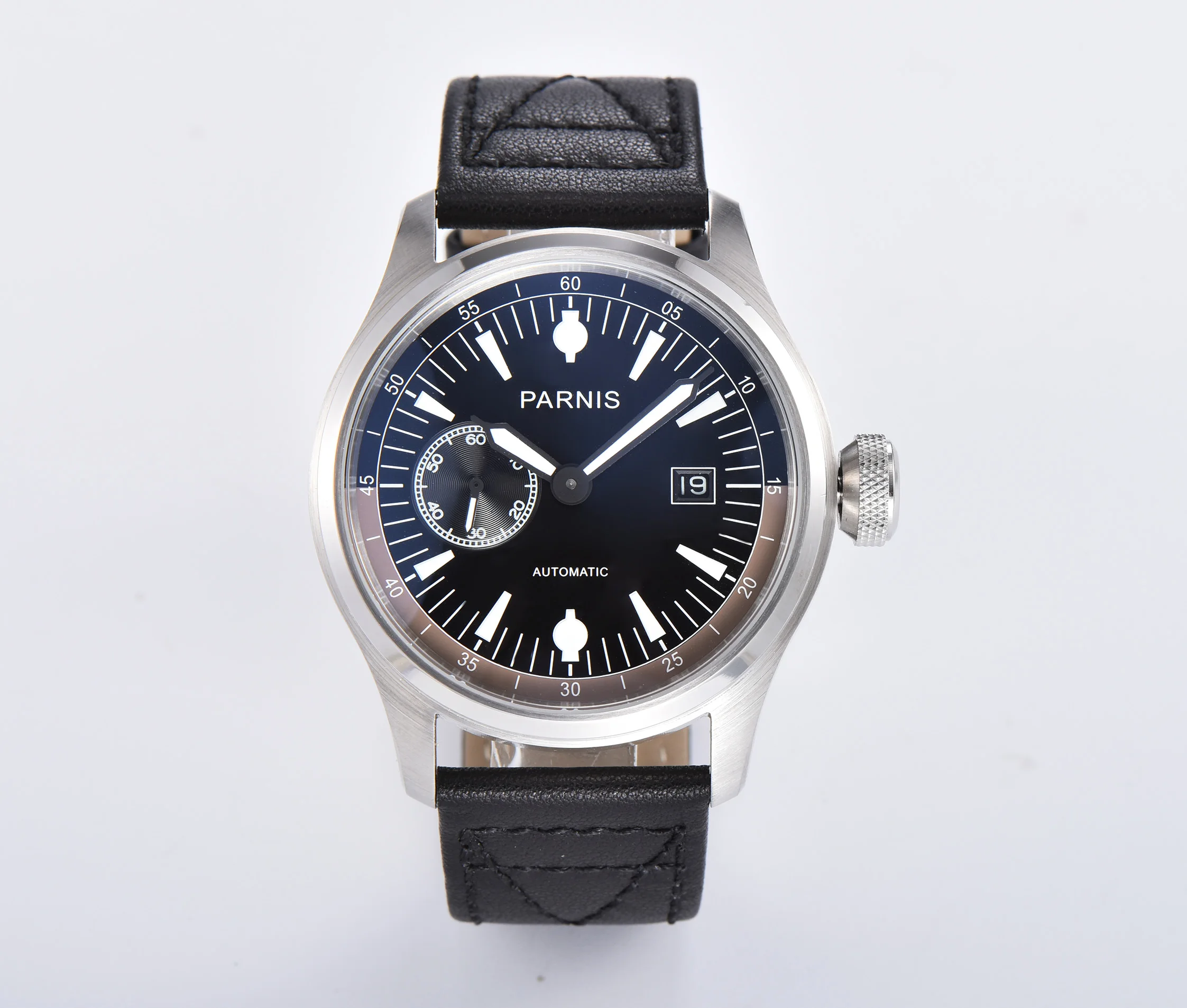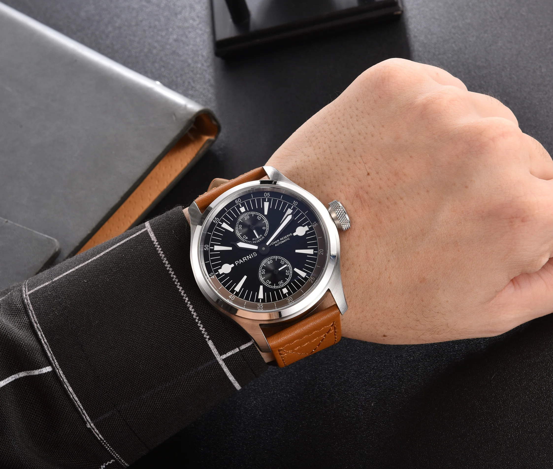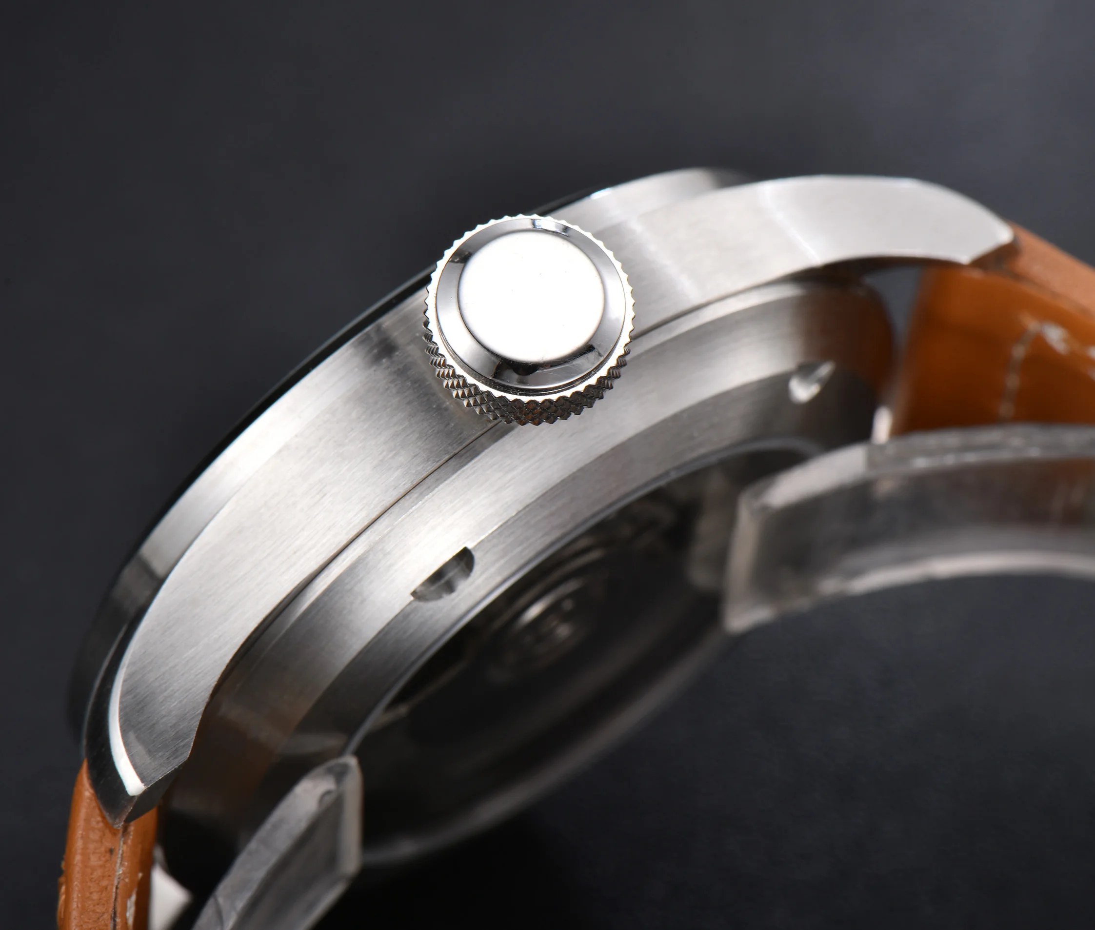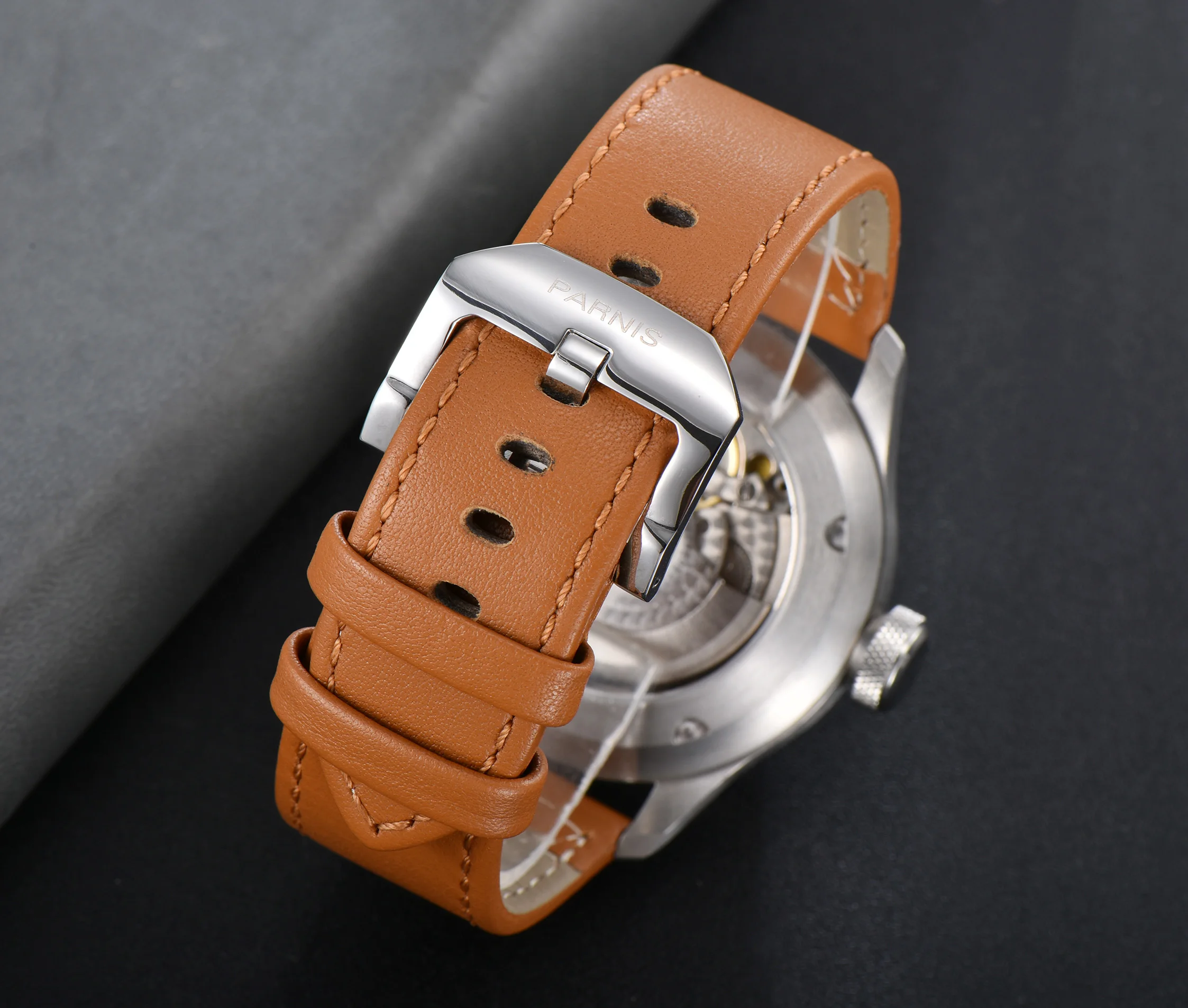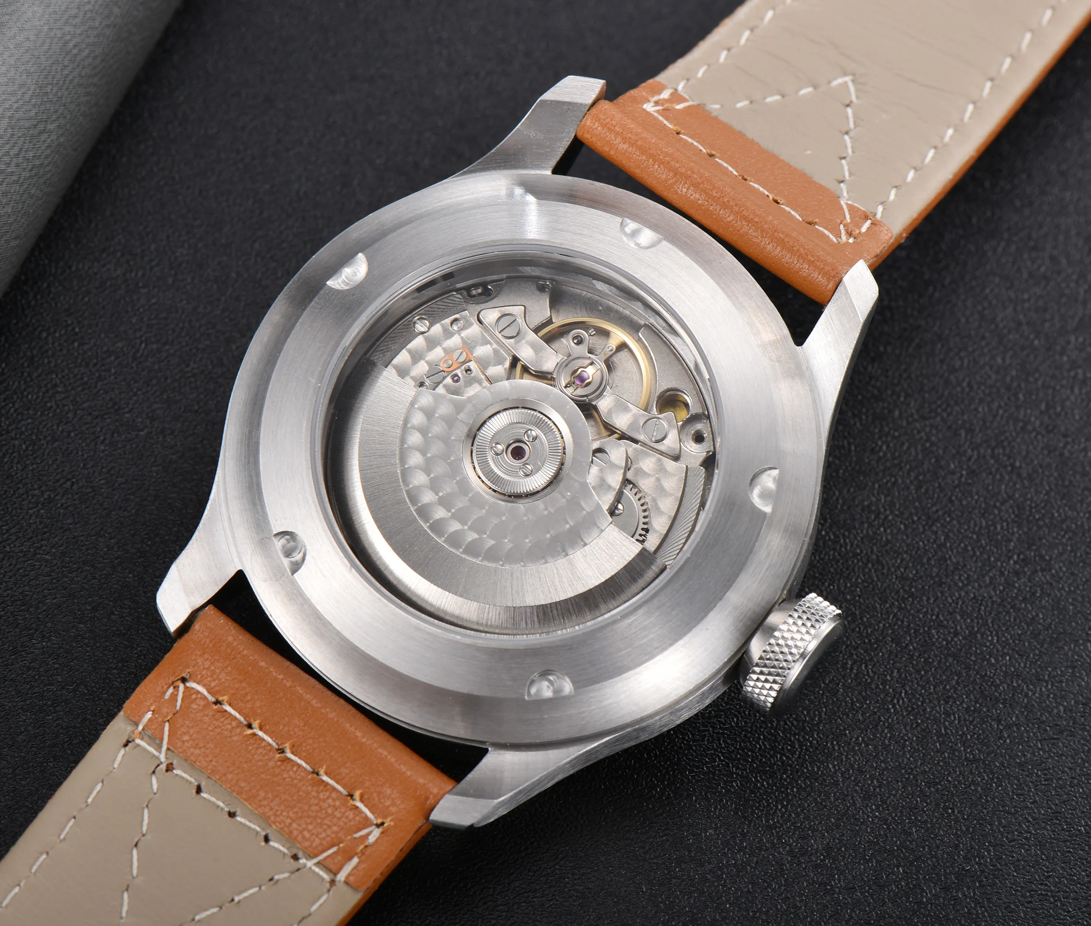 Механизм: автоматический механизм Seagull ST2542 Материал корпуса: корпус из нержавеющей стали 316L/прозрачная задняя крышка Диаметр корпуса: 47 мм Толщина корпуса: 16 мм Ширина ремешка: 24 мм Циферблат: черный циферблат с белыми цифрами Стекло: минеральное стекло с защитой от царапин Ремешок: ремешок из натуральной коричневой кожи с пряжкой из нержавеющей стали