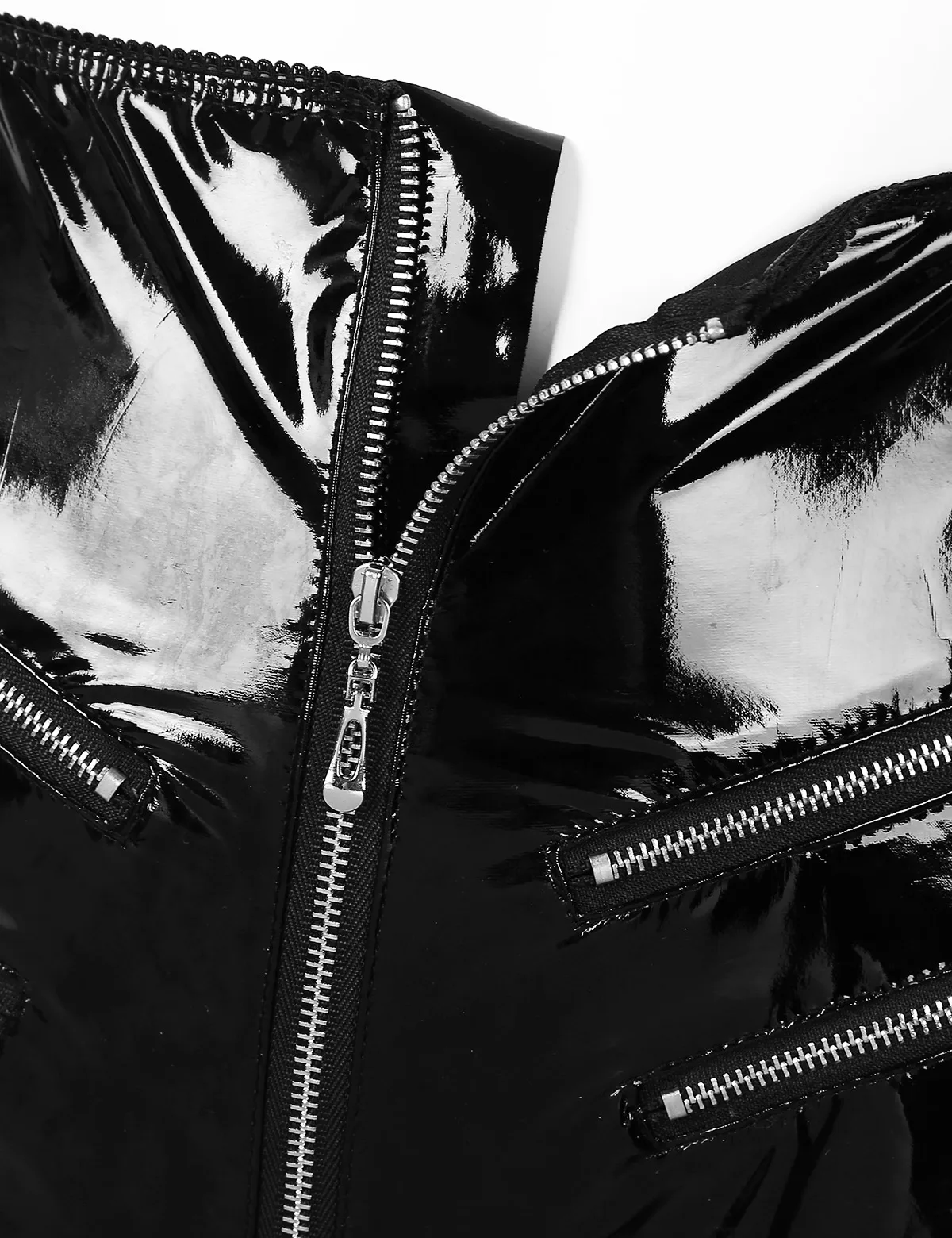 Высокая талия с молнией от талии до спины, четыре Поддельные молнии, украшенные спереди, высокие вырезанные ноги, зауженный крой.