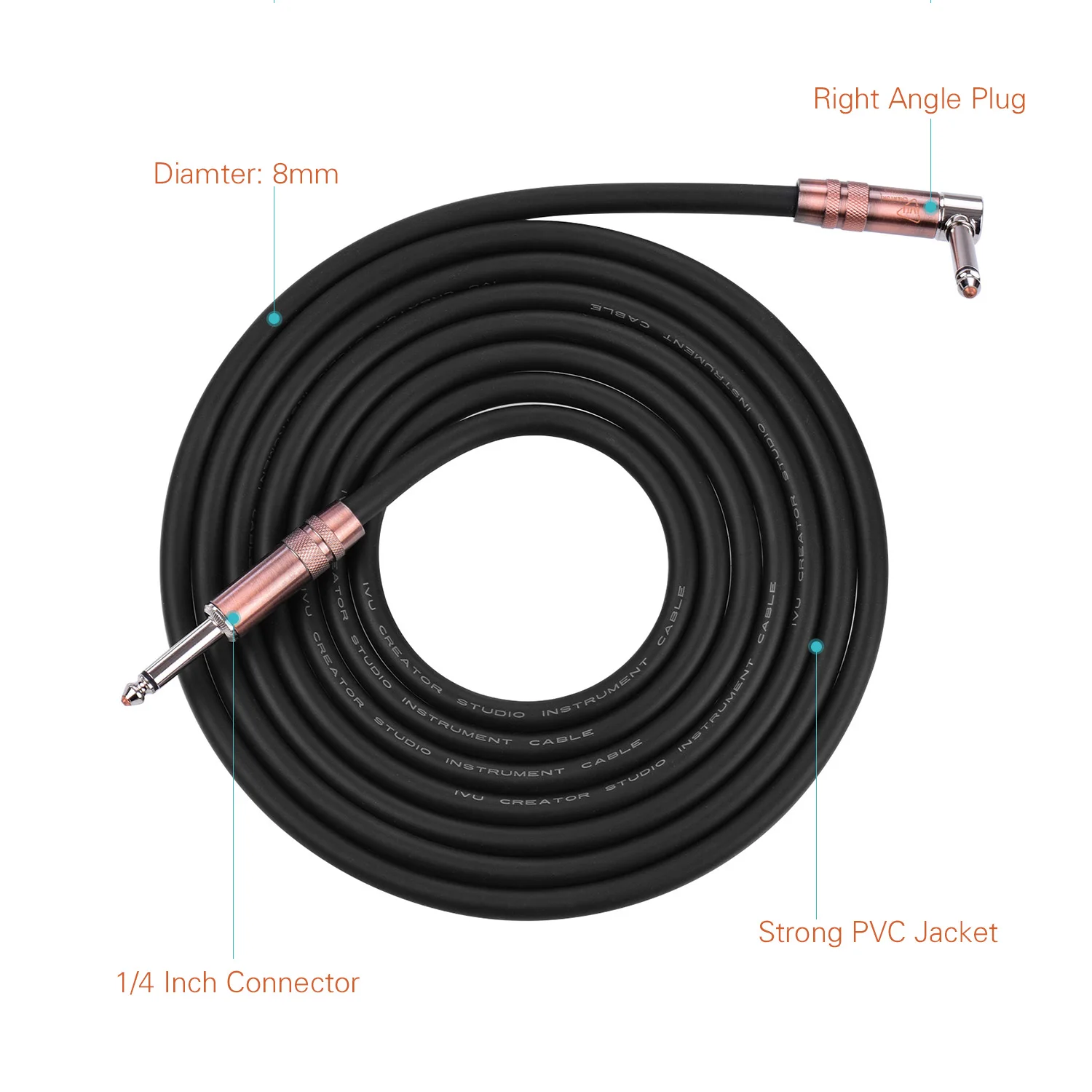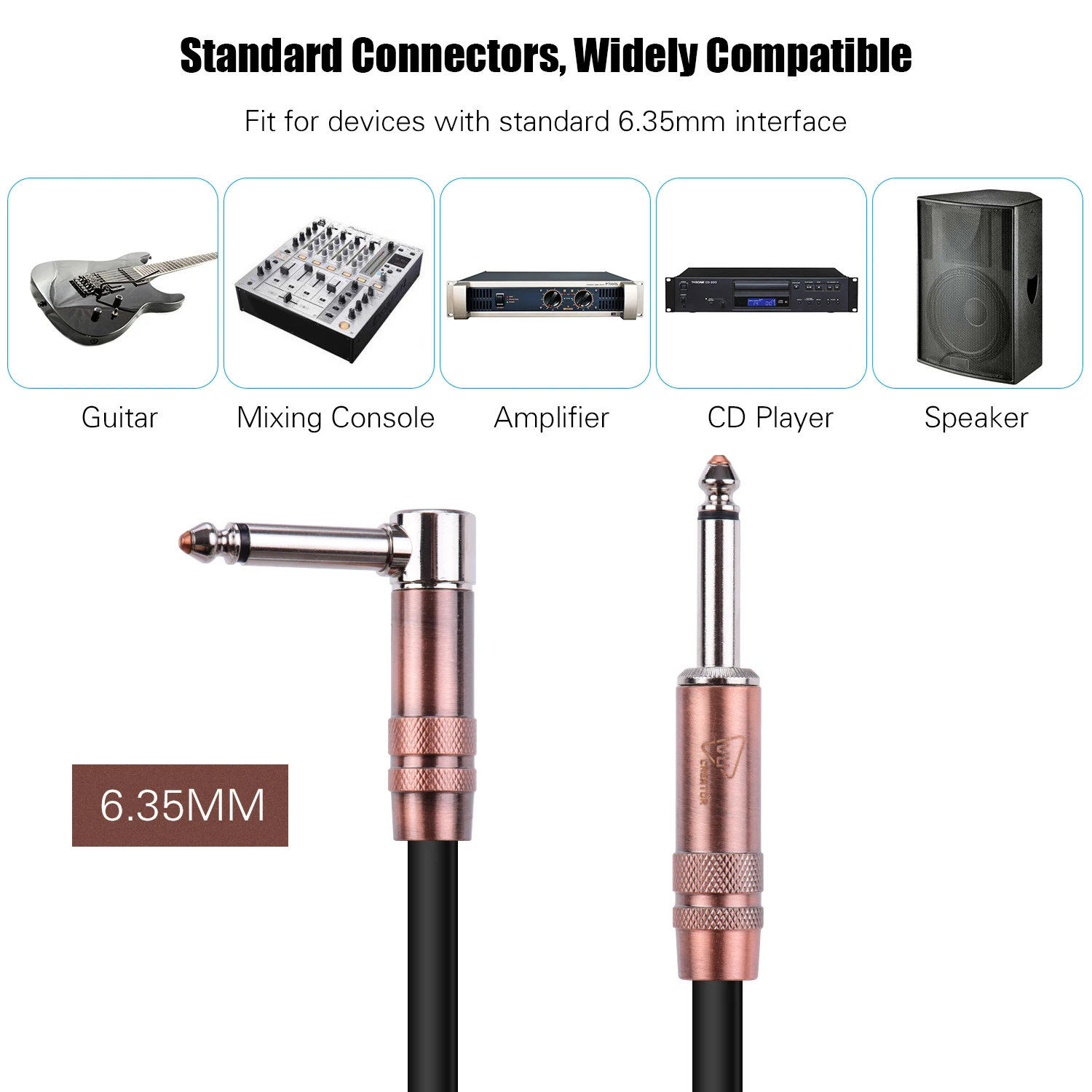 Прямые и прямые металлические разъемы 1/4 дюйма обеспечивают стабильное соединение с любыми музыкальными инструментами. L-образная форма штепсельной вилки менее ломкая и более прочная.