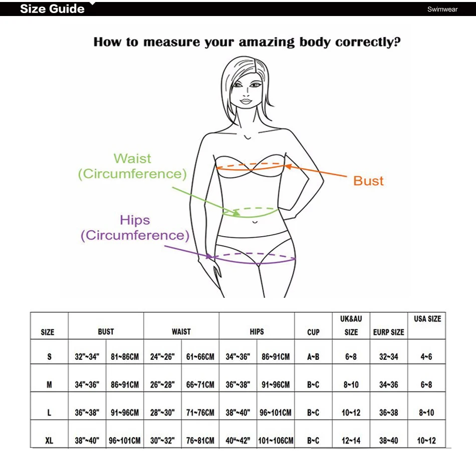 После измерения объема груди, талии и бедер выберите аналогичный размер в соответствии со следующей таблицей размеров