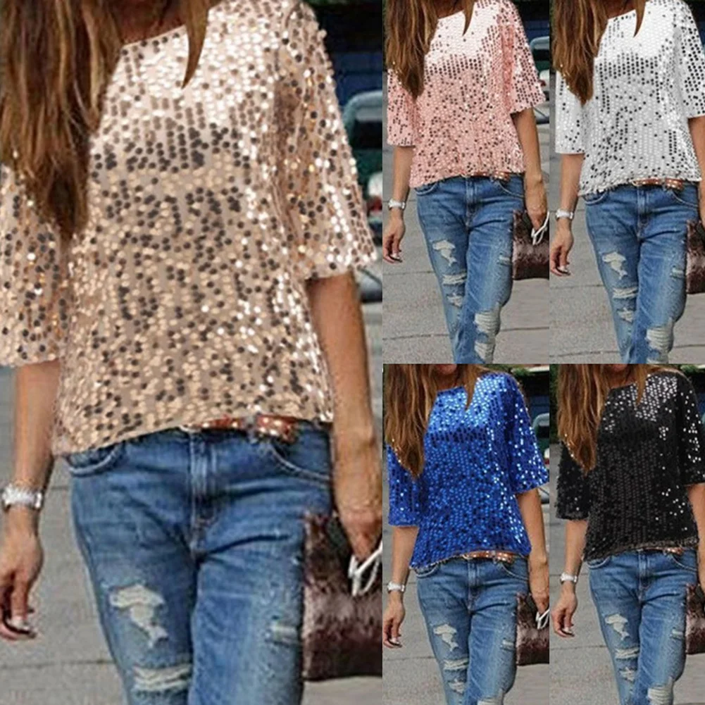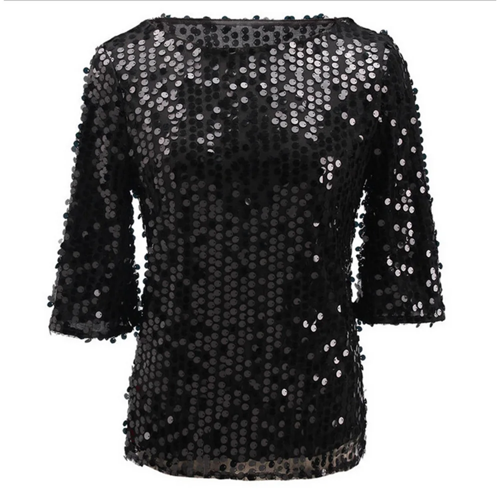 Женская однотонная блузка с круглым вырезом и коротким рукавом, расшитая блестками, размера плюс футболка для коктейльной вечеринки
