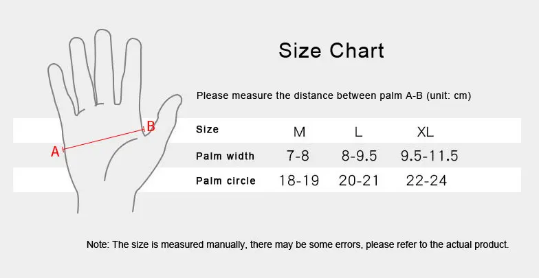 Измерьте расстояние между A-B ладони (единица измерения: см) Примечание: размер измеряется вручную, могут быть некоторые ошибки, пожалуйста, обратитесь к фактическому продукту.